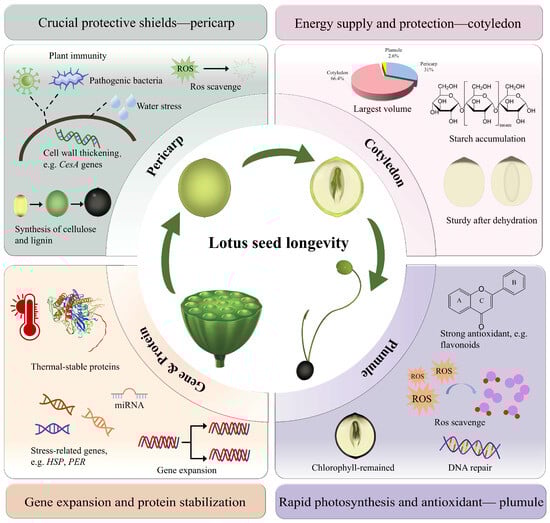 Recent years have seen substantial progress in understanding the longevity mechanisms of lotus seeds through gene function and molecular biology studies. Heterologous expression of the cytoplasmic class II small heat shock protein gene NnHSP17.5, along with the metallothionein genes NnMT2a and NnMT3 in Arabidopsis, has been shown to significantly improve seed germination viability, with NnHSP17.5 also conferring thermotolerance to seedlings [69,70]. Lotus contains eight antioxidant 1-cys peroxidase (PER) genes. Overexpressing NnPER1 in Arabidopsis reduces DNA damage and lipid peroxidation, thereby improving seed stability and extending seed longevity [64,71]. Chen et al. [1] conducted a genome-wide identification of the NnLEA gene family in lotus and found that most NnLEAs are highly expressed in the late stages of lotus seed development, indicating their crucial role in the dehydration stress response. Additionally, HSP genes related to cell homeostasis maintenance and protein folding may protect against dehydration-induced stress during lotus seed maturation [24,64]. A recent study explored the internal mechanisms behind the longevity of lotus seeds from physiological, biochemical, and molecular perspectives. The results indicated that the tissue structure of lotus seeds plays an essential role in their longevity [64]. The robust structure of the pericarp, along with its high content of antioxidants such as flavonoids and polyphenols, provides protection and high antioxidant activity. The starch-rich cotyledons and chlorophyll-retaining plumules not only provide sufficient energy for long-term storage and germination but also facilitate rapid photosynthesis post-germination [64]. The survival of lotus seeds over centuries offers an exemplary model for studying seed adaptation mechanisms [72]. Sun et al. [64] found that the number of genes related to seed maturation and defense response in the lotus genome significantly expands under prolonged adverse storage conditions, which may be the result of adaptive evolution. Furthermore, results from high-throughput miRNA sequencing and degradome analysis indicate that the germination of lotus seeds is regulated by miRNAs, providing novel insights for future research on longevity mechanisms [73]. In conclusion, the remarkable longevity of the lotus seed is facilitated by the contributions of its intrinsic structural components, as well as the complex regulation of genes and protein functions (Figure 5).