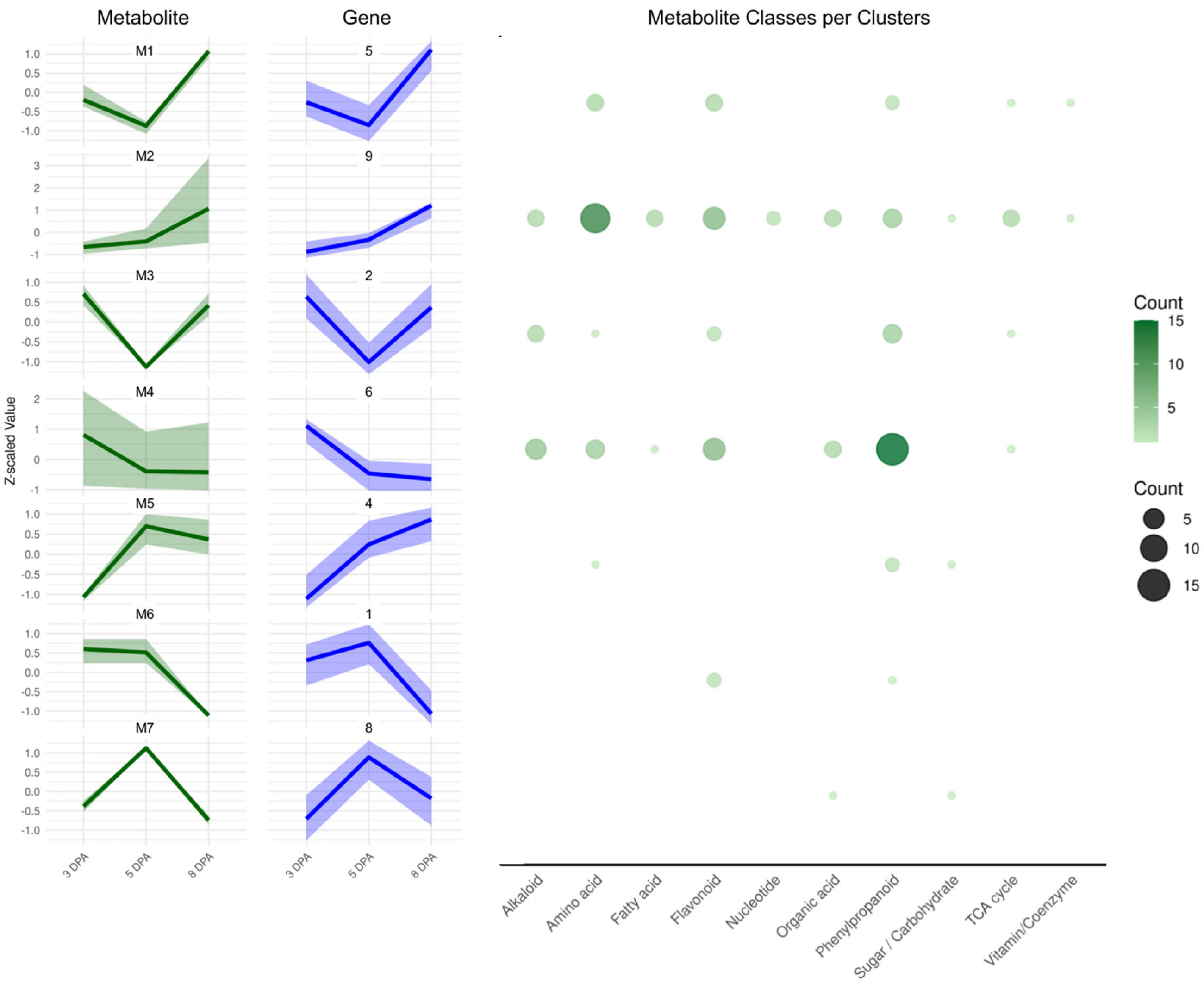 2.5. Integration of Metabolite Clusters with Gene Expression