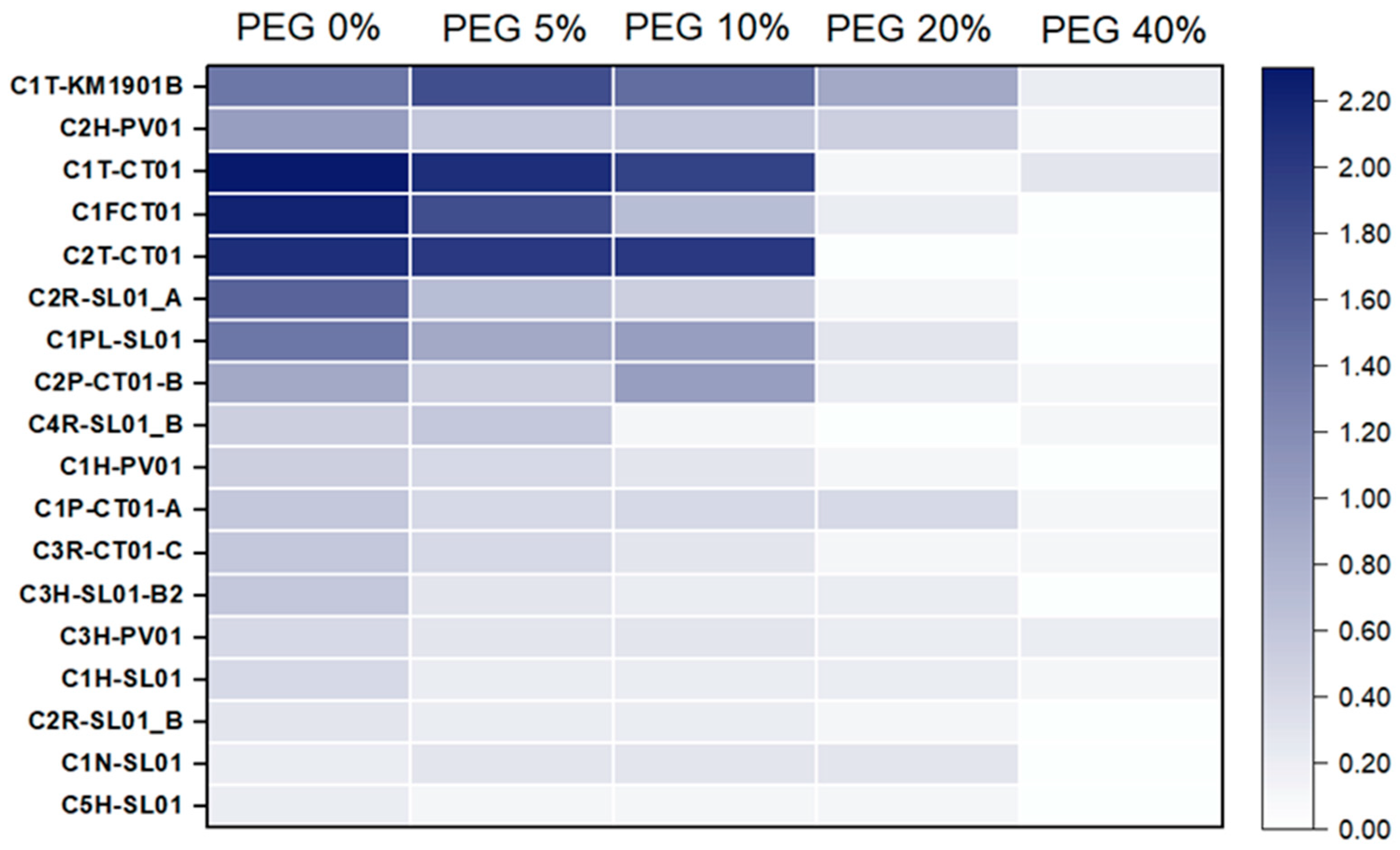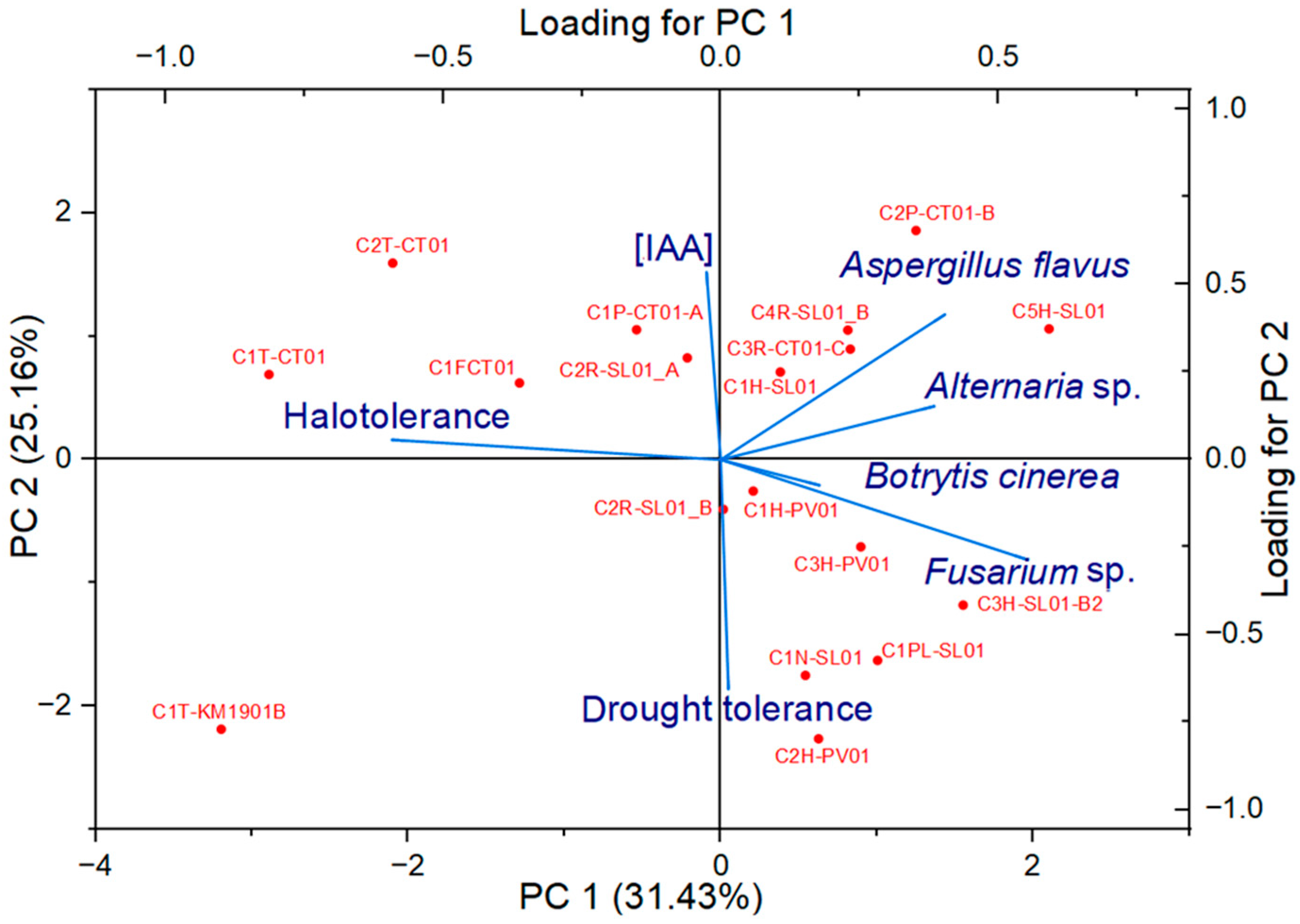 3.3. Tolerance of Endophytic Isolates to PEG-Induced Drought Stress