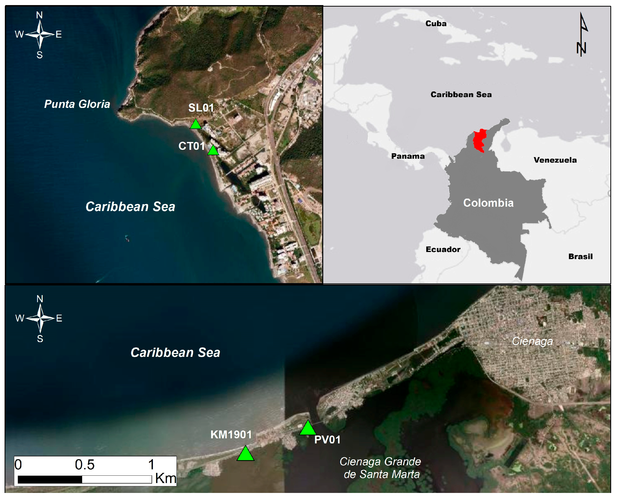 - Villate Daza, D.A.; Moreno, H.S.; Portz, L.; Manzolli, R.P.; Bolívar-Anillo, H.J.; Anfuso, G. Mangrove Forests Evolution and Threats in the Caribbean Sea of Colombia. Water 2020, 12, 1113. [Google Scholar] [CrossRef]