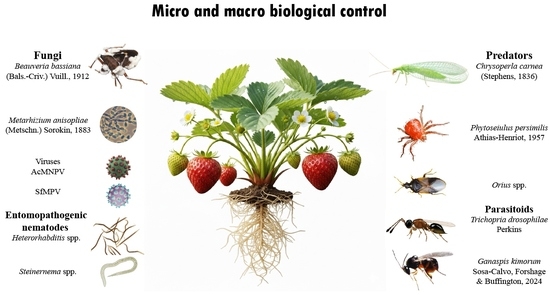 - Cross, J.V.; Easterbrook, M.A.; Crook, A.M.; Crook, D.; Fitzgerald, J.D.; Innocenzi, P.J.; Jay, C.N.; Solomon, M.G. Review: Natural Enemies and Biocontrol of Pests of Strawberry in Northern and Central Europe. Biocontrol Sci. Technol. 2001, 11, 165–216. [Google Scholar] [CrossRef]
