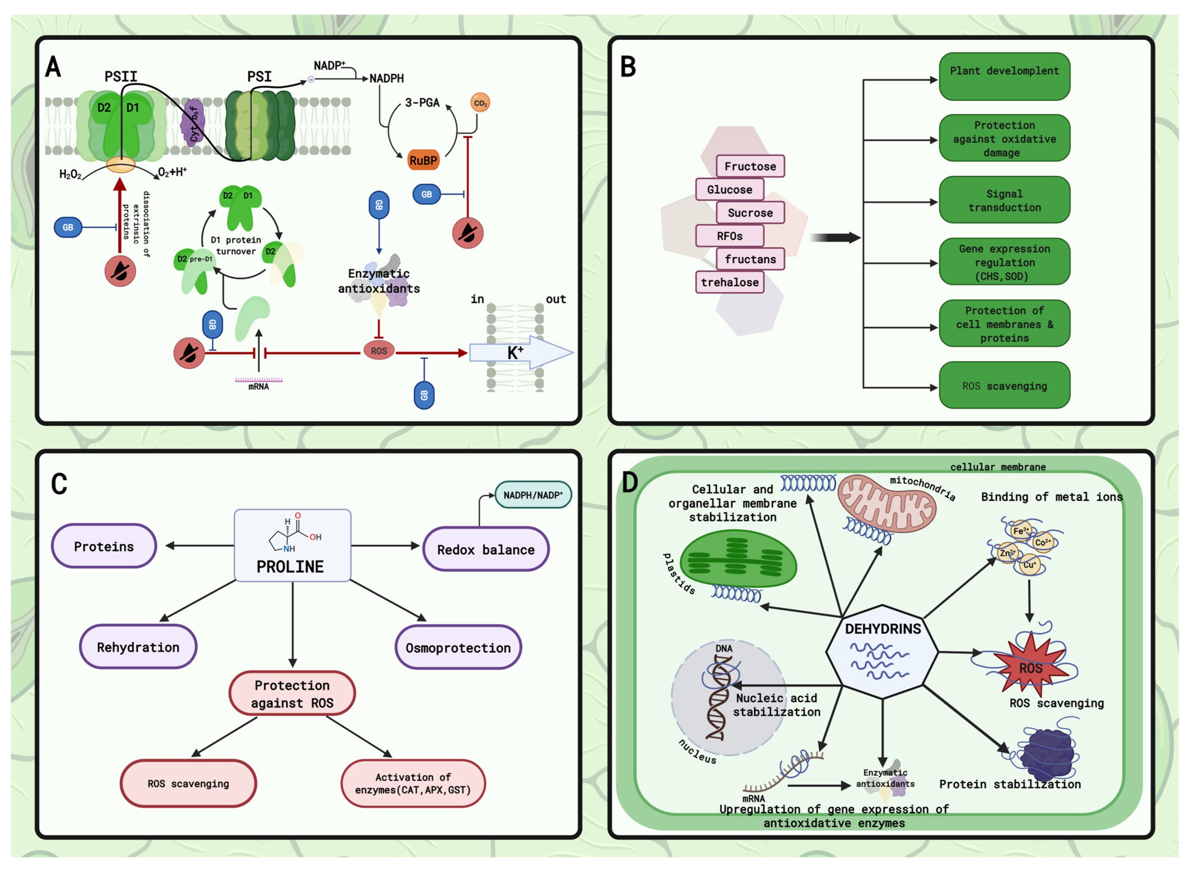 | Chromatography | HPLC | Proline, glycine betaine, sugars | highly specific, sensitive, time-consuming sample preparation, requirement of complex instrumentation | Not applicable | [236,239] |