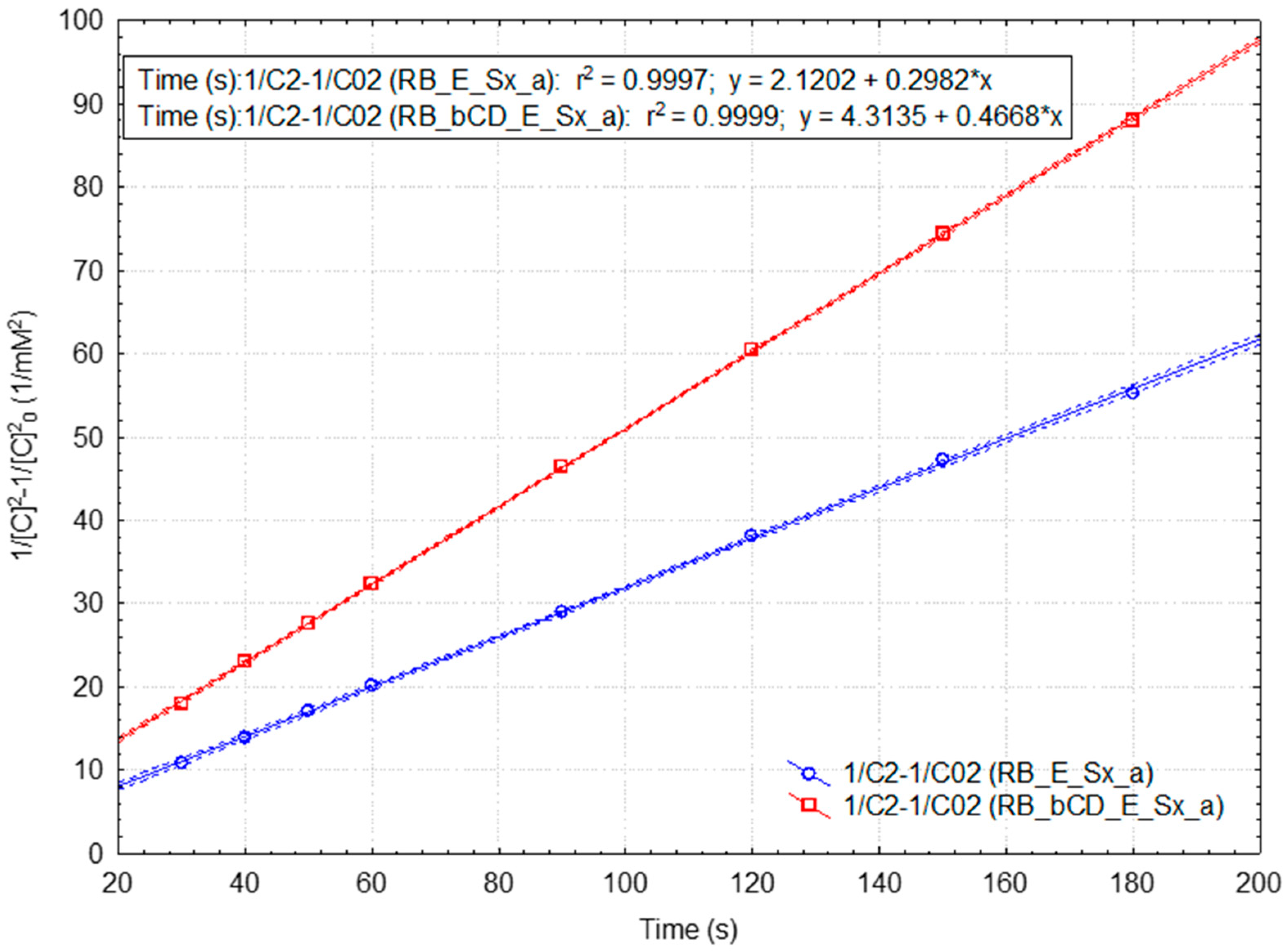 n = 7, r = 0.9997, r2 = 0.9994, F = 9246, p < 10−5, s = 0.008