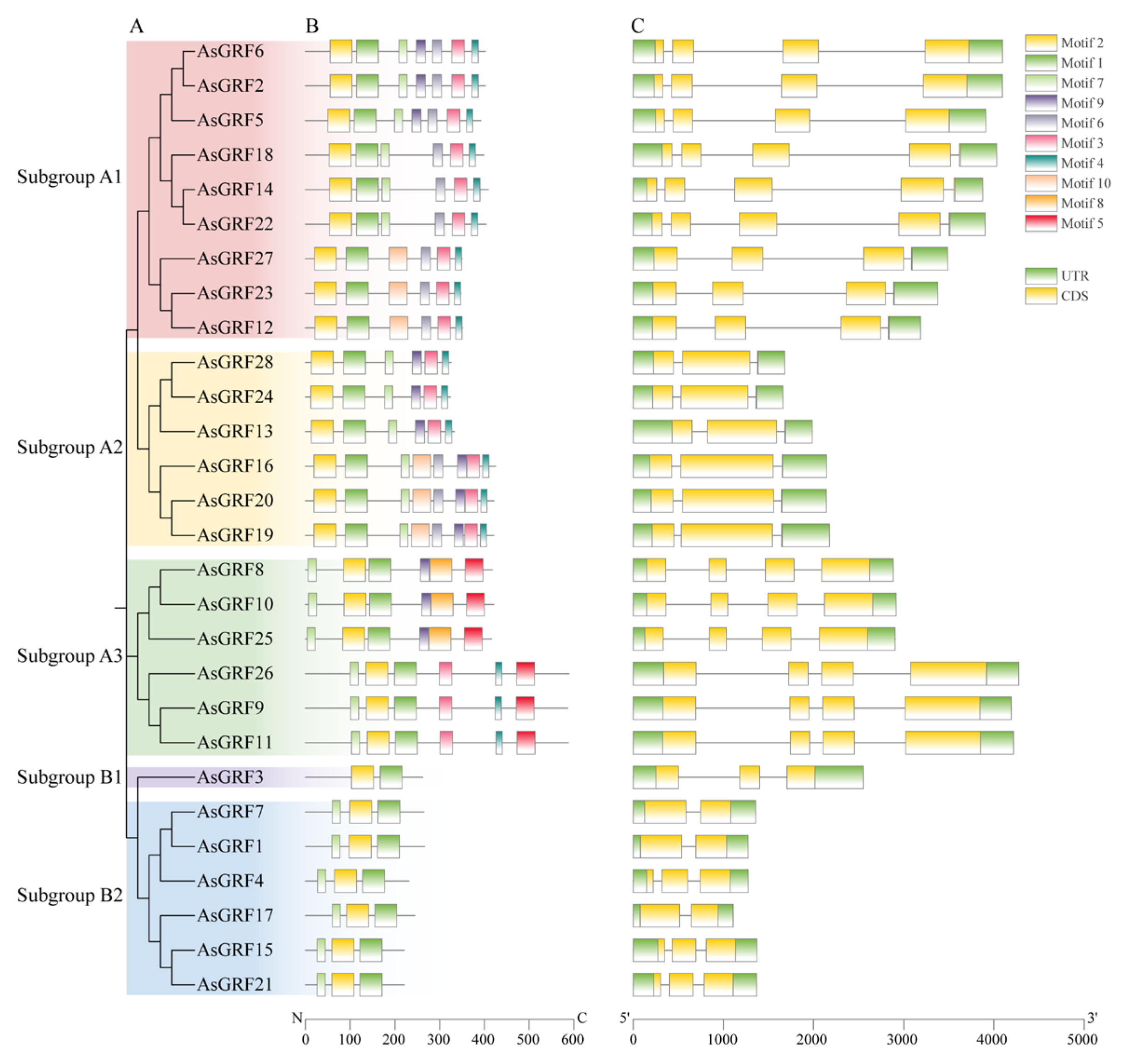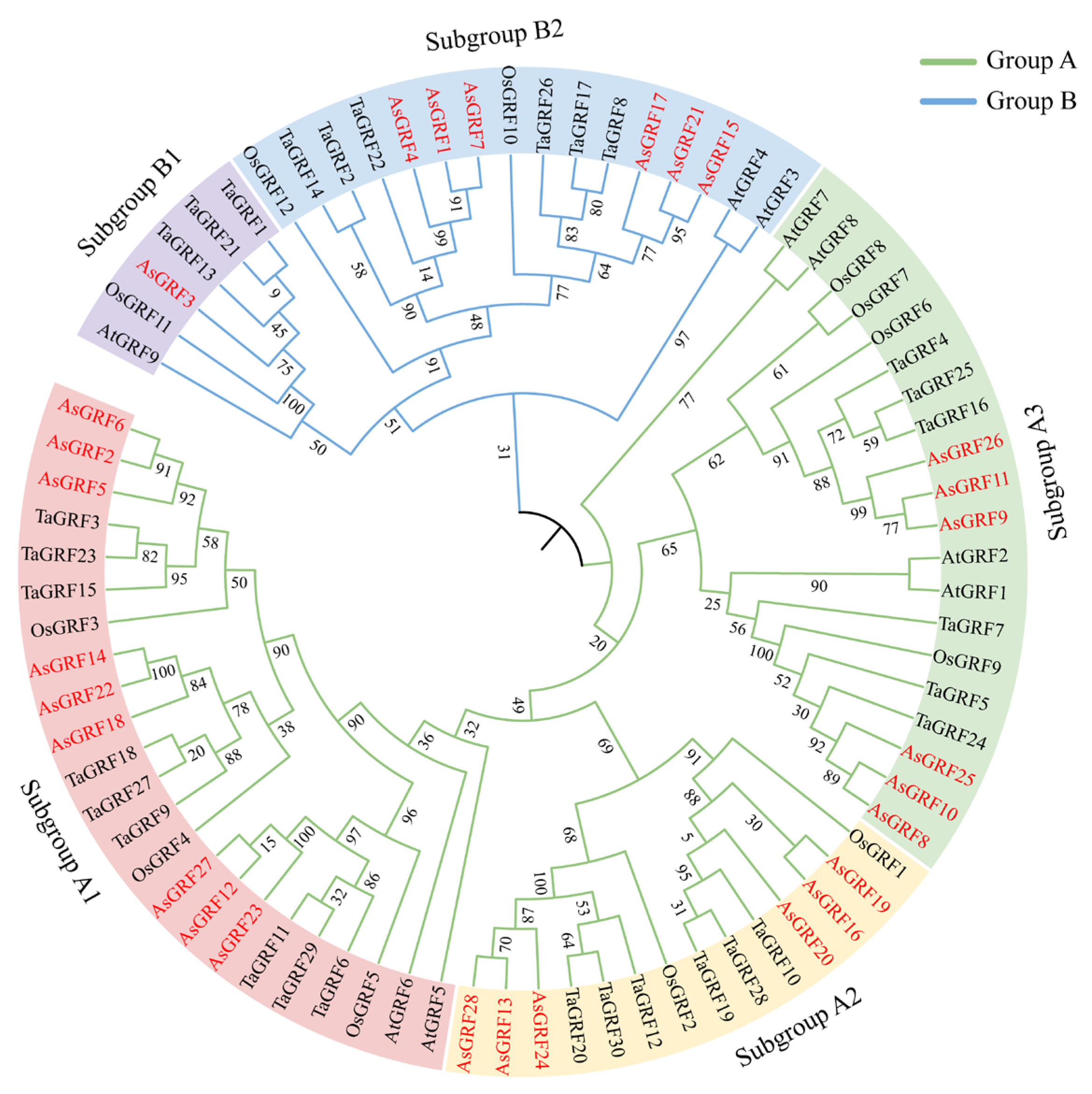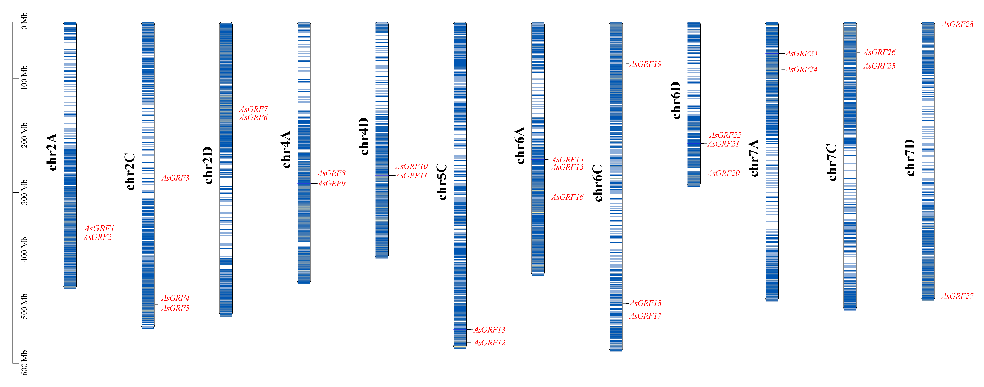2.2. Chromosomal Distribution and Phylogenetic Analysis of AsGRF Genes
