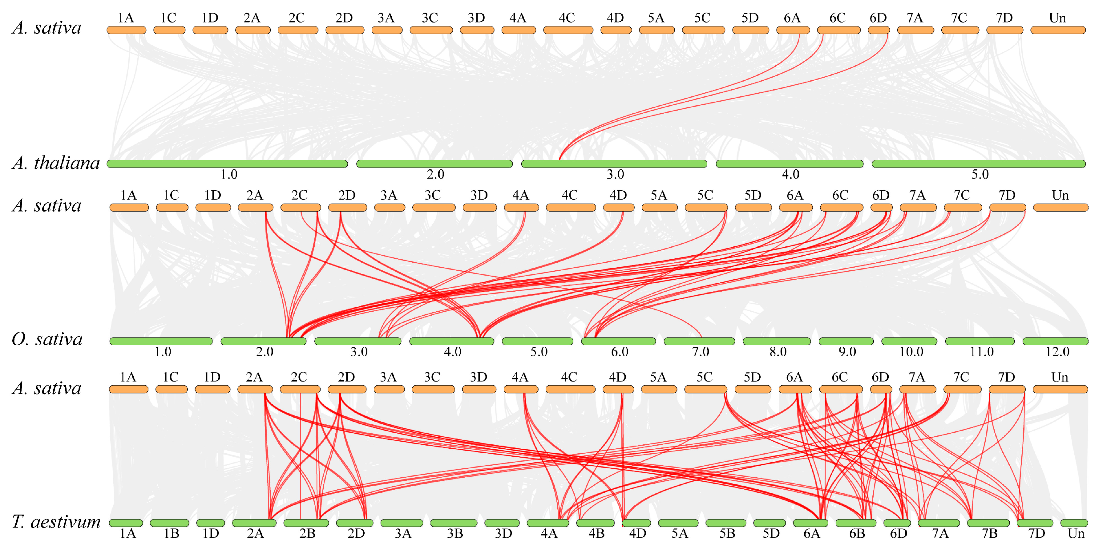 - He, Q.; Li, W.; Miao, Y.Q.; Wang, Y.; Liu, N.K.; Liu, J.N.; Li, T.; Xiao, Y.; Zhang, H.Y.; Wang, Y.R.; et al. The near-complete genome assembly of hexaploid wild oat reveals its genome evolution and divergence with cultivated oats. Nat. Plants 2024, 10, 2062–2078. [Google Scholar] [CrossRef]
