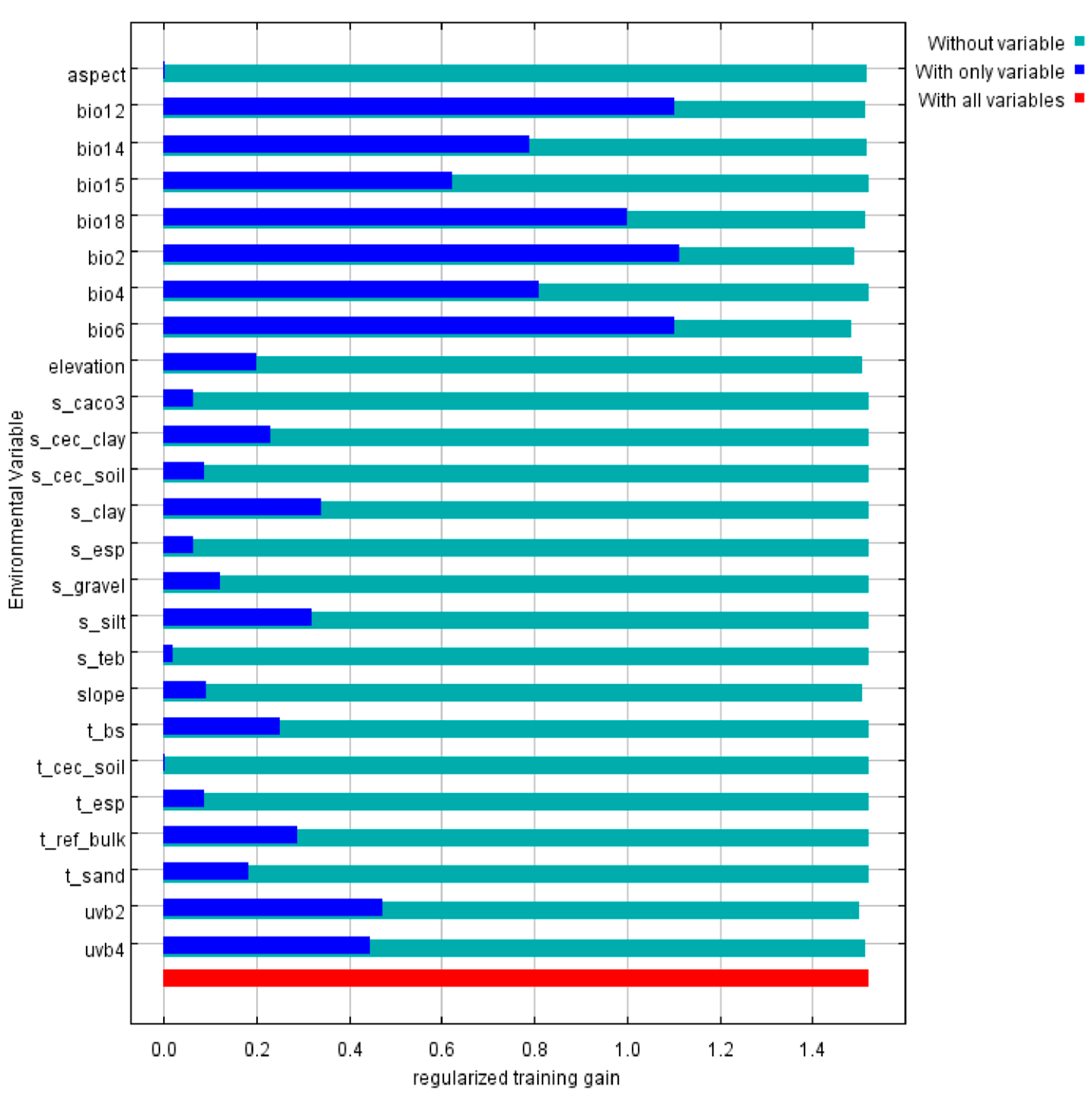 | Species | Bio2 | Bio6 | Bio7 | UVB1 | Contributions (%) of the Top Four Environmental Variables |