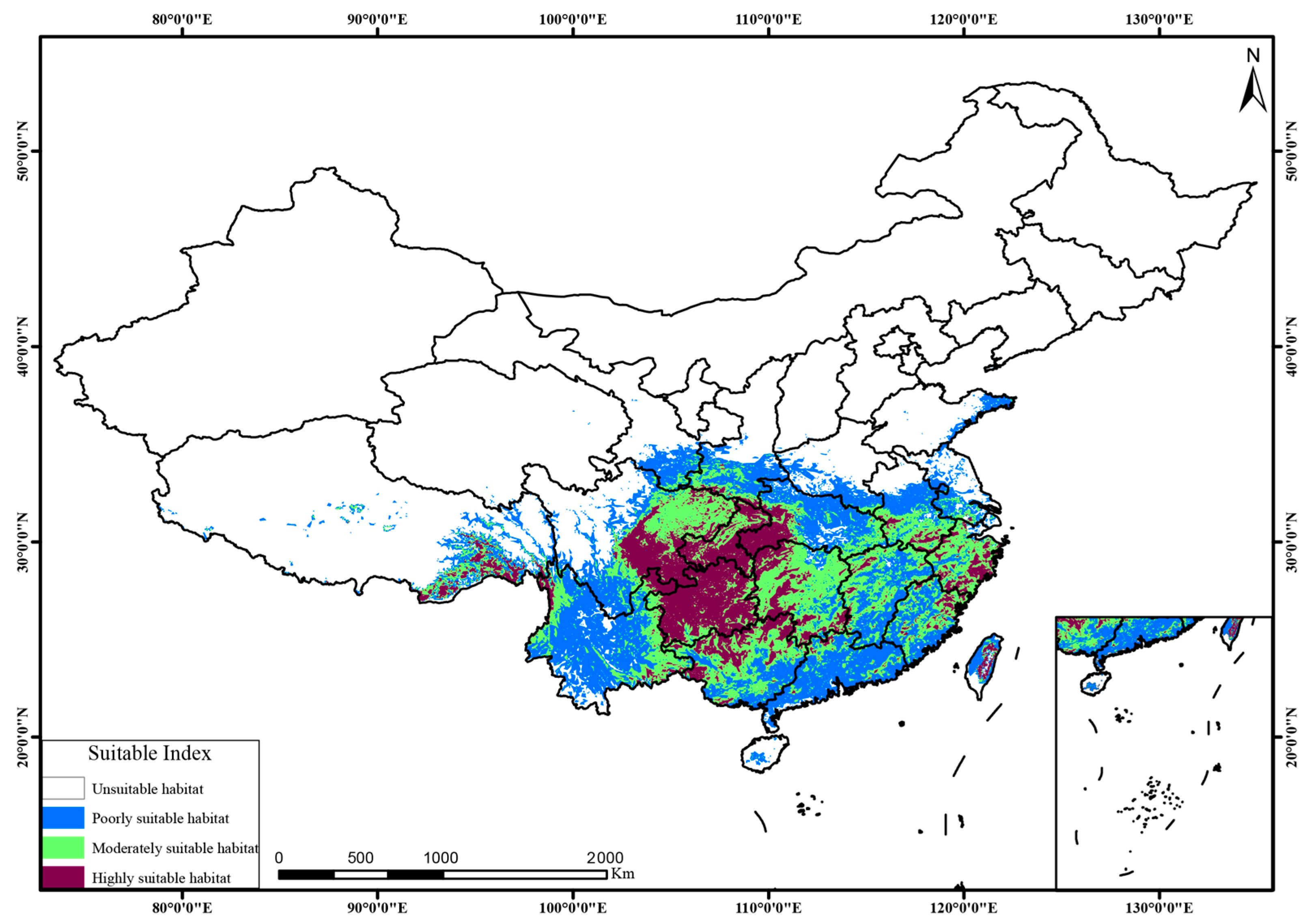 - Luo, W.J.; Lapuz, R.S.; Wee, A.K.S. Large-scale changes in the distribution of suitable habitat of the endangered subtropical canopy tree species Vatica guangxiensis under climate change. Biodivers. Conserv. 2024, 33, 3187–3205. [Google Scholar] [CrossRef]