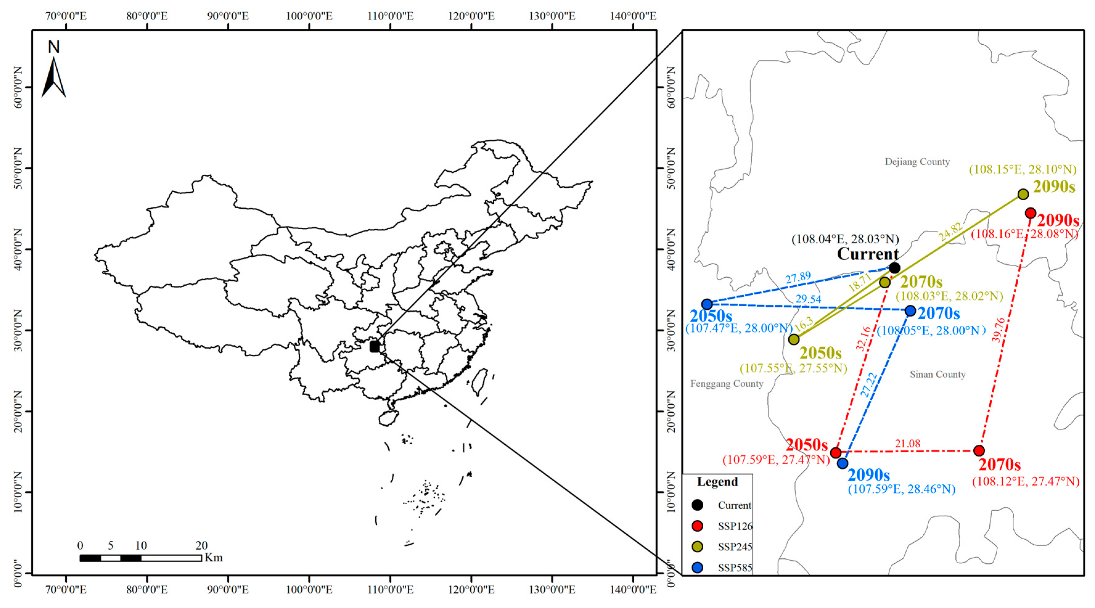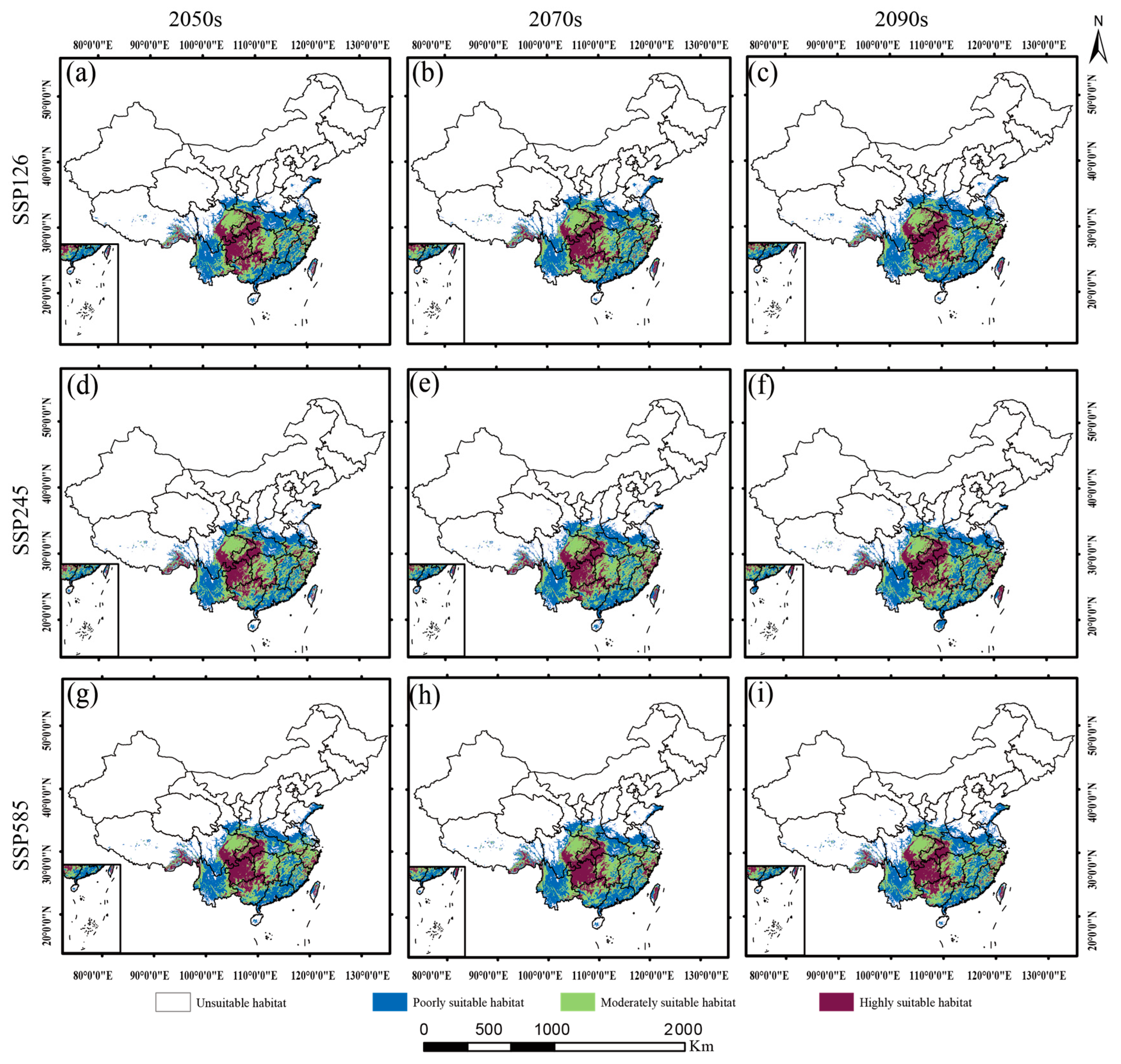 2.5. Suitable Habitats of Dysosma Under Current and Future Climate Scenarios