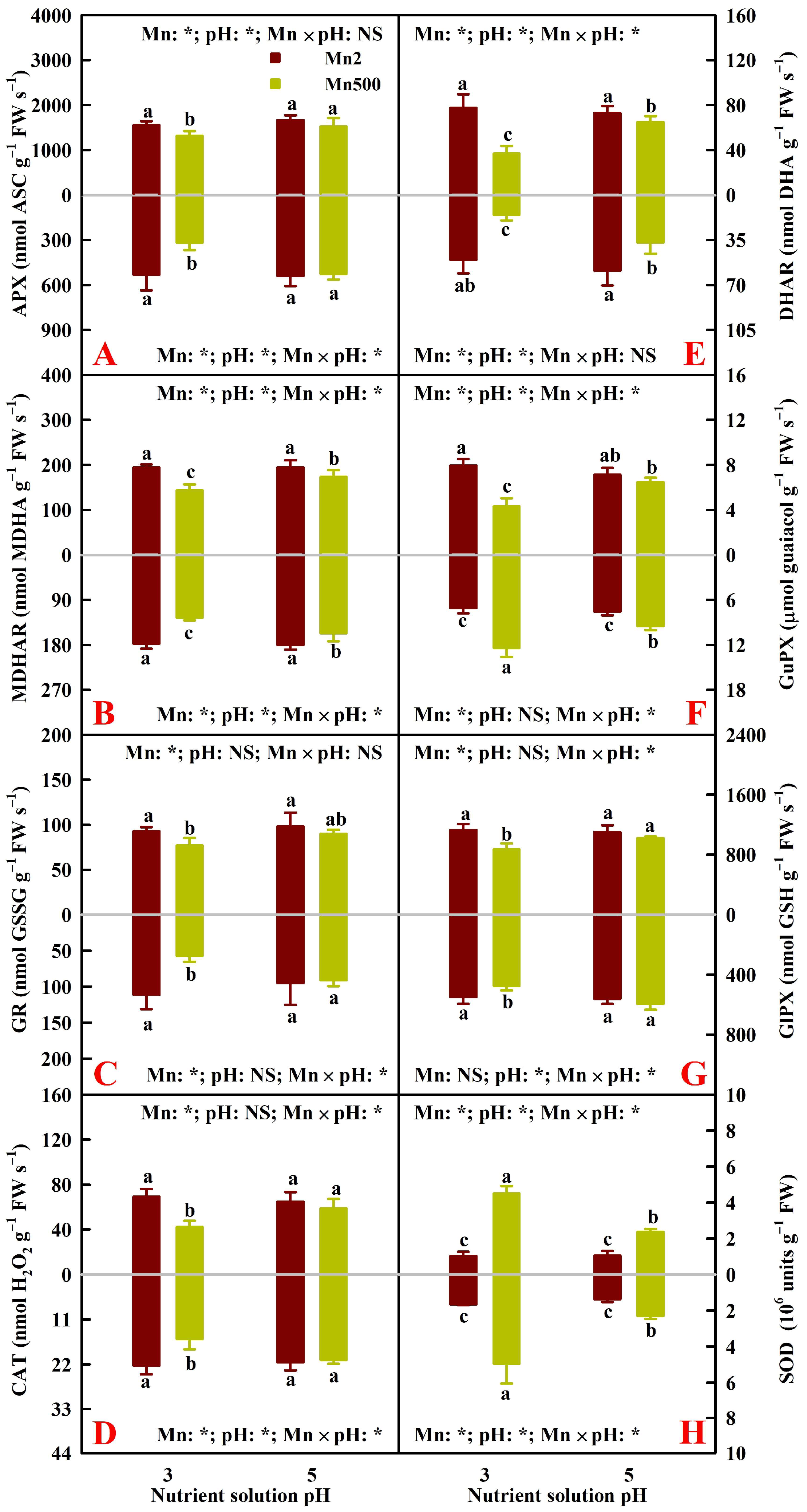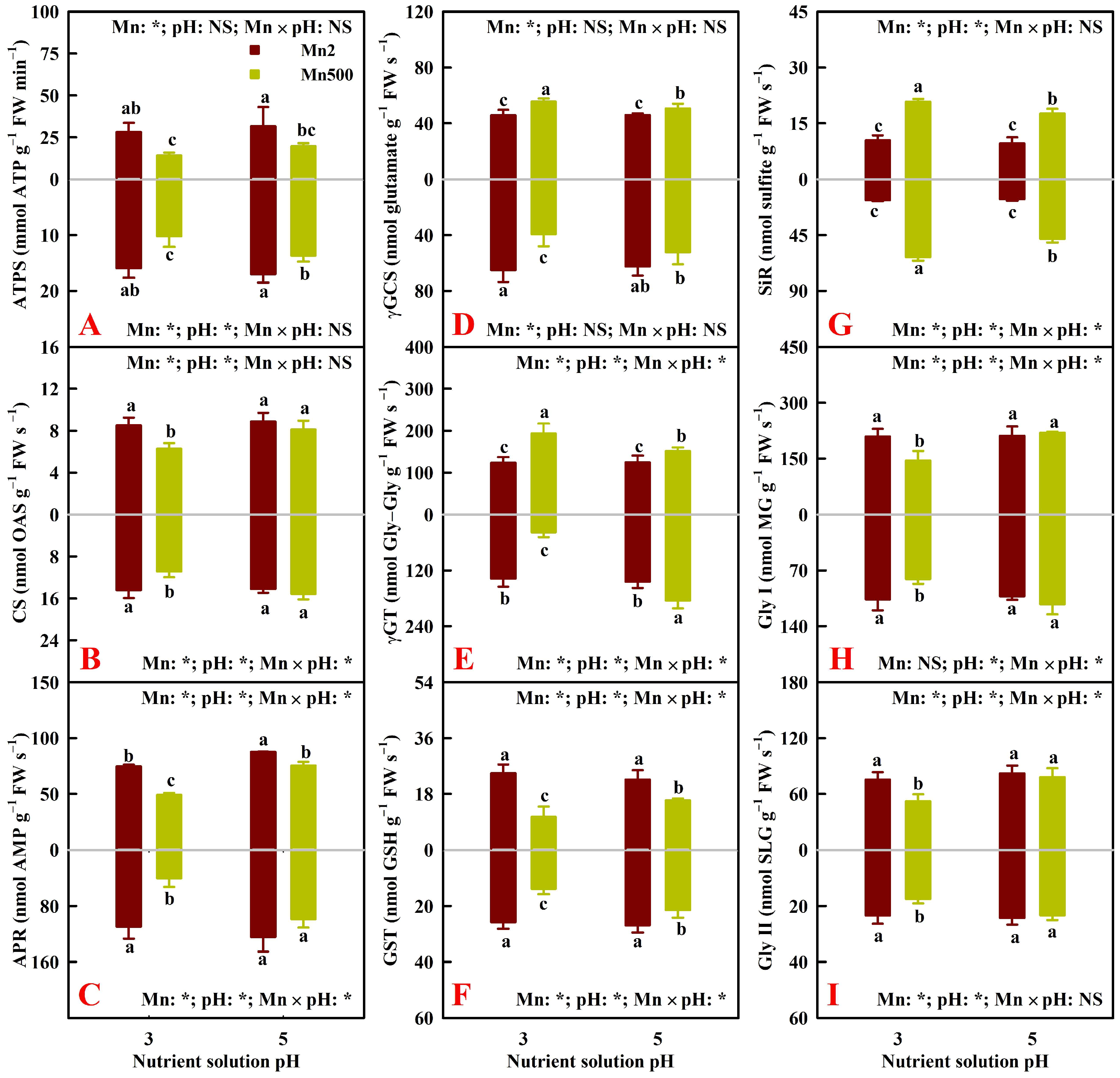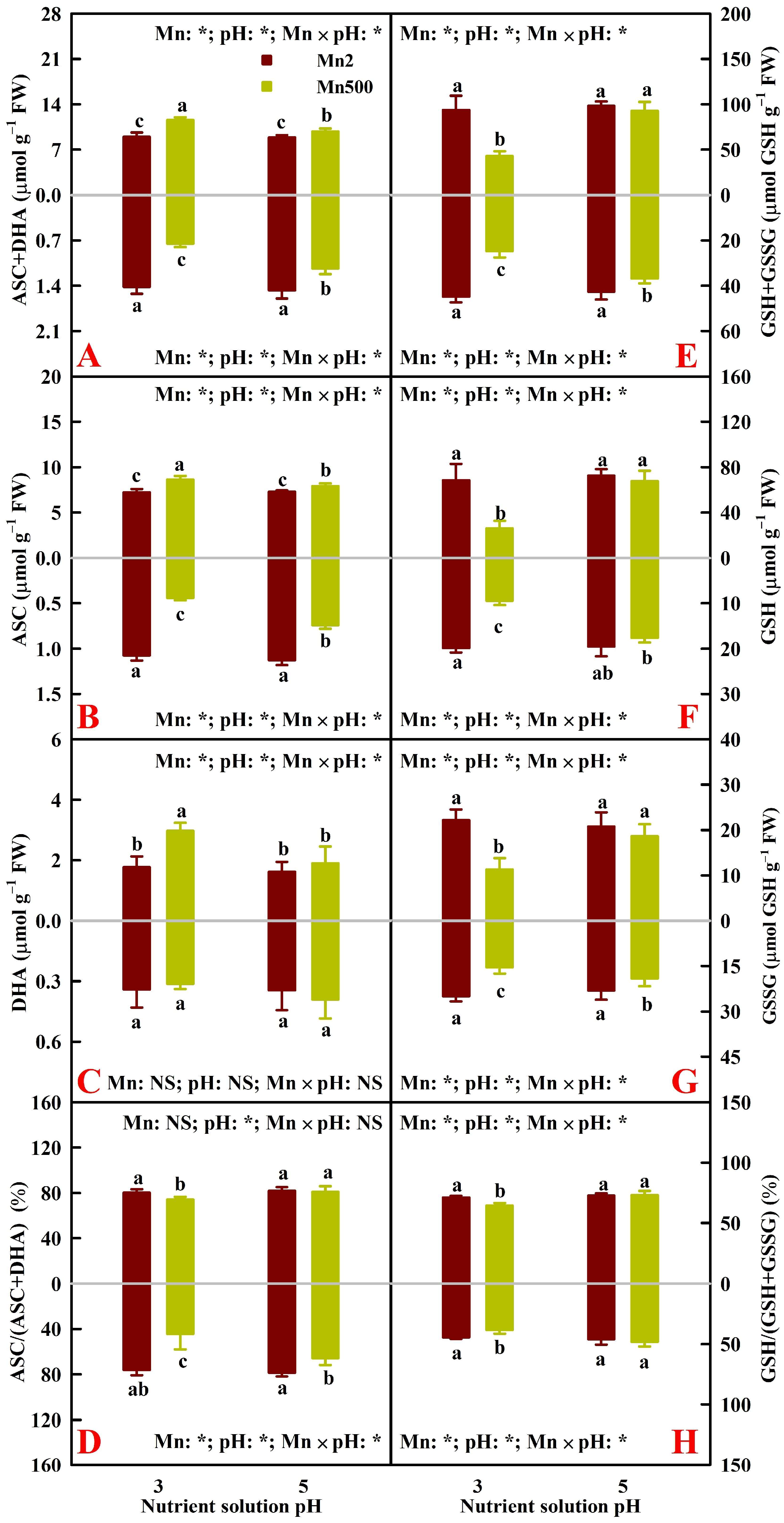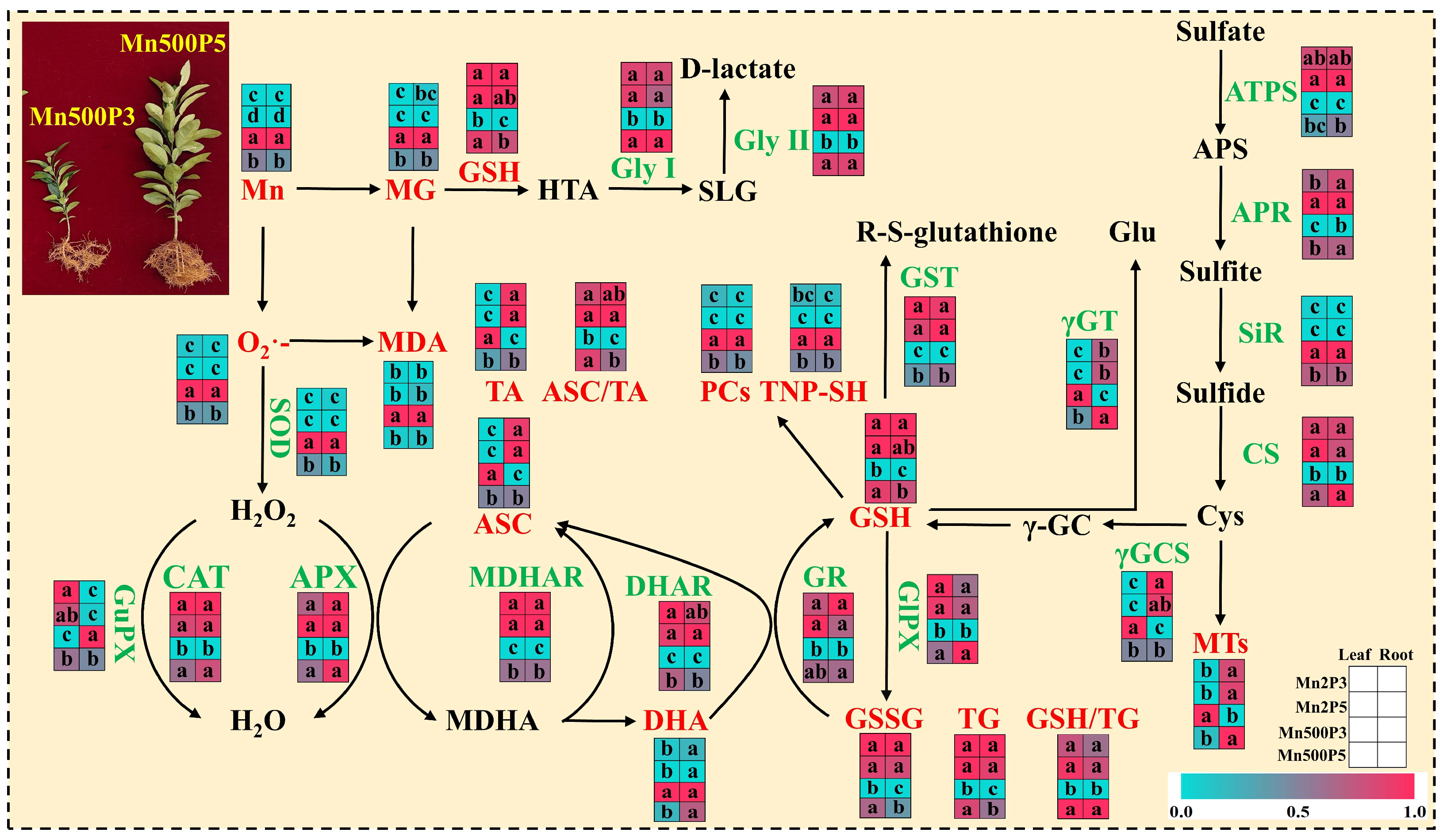 2.1. Augmenting pH Attenuated Excessive Mn-Induced Changes in ROS Production, MG, MDA, S-Containing Compounds, and Antioxidant Concentrations in Roots and Leaves
