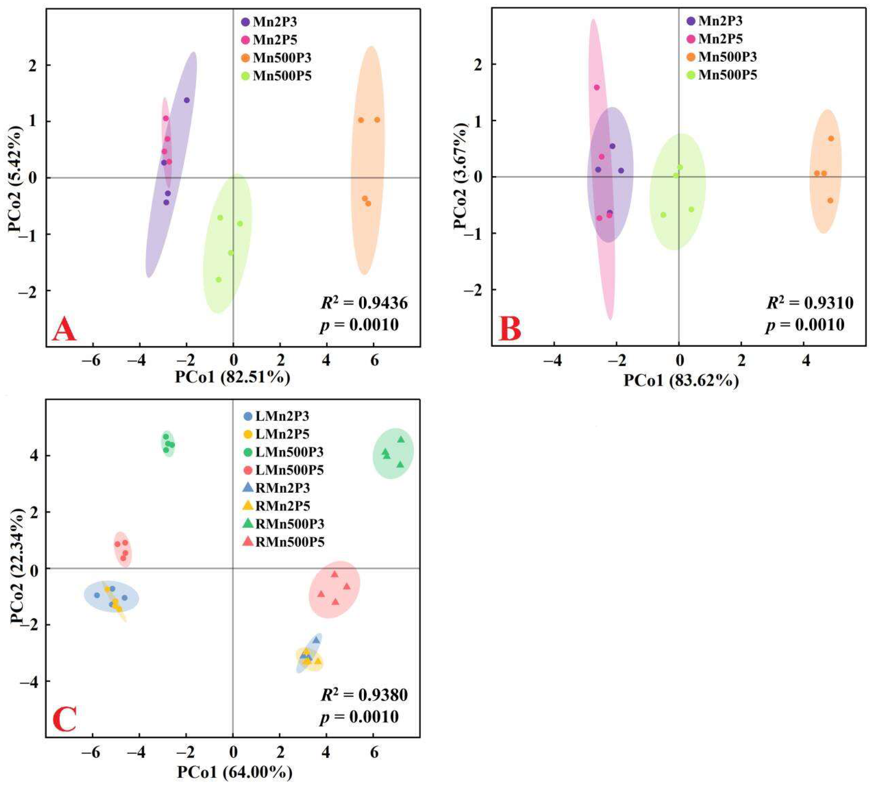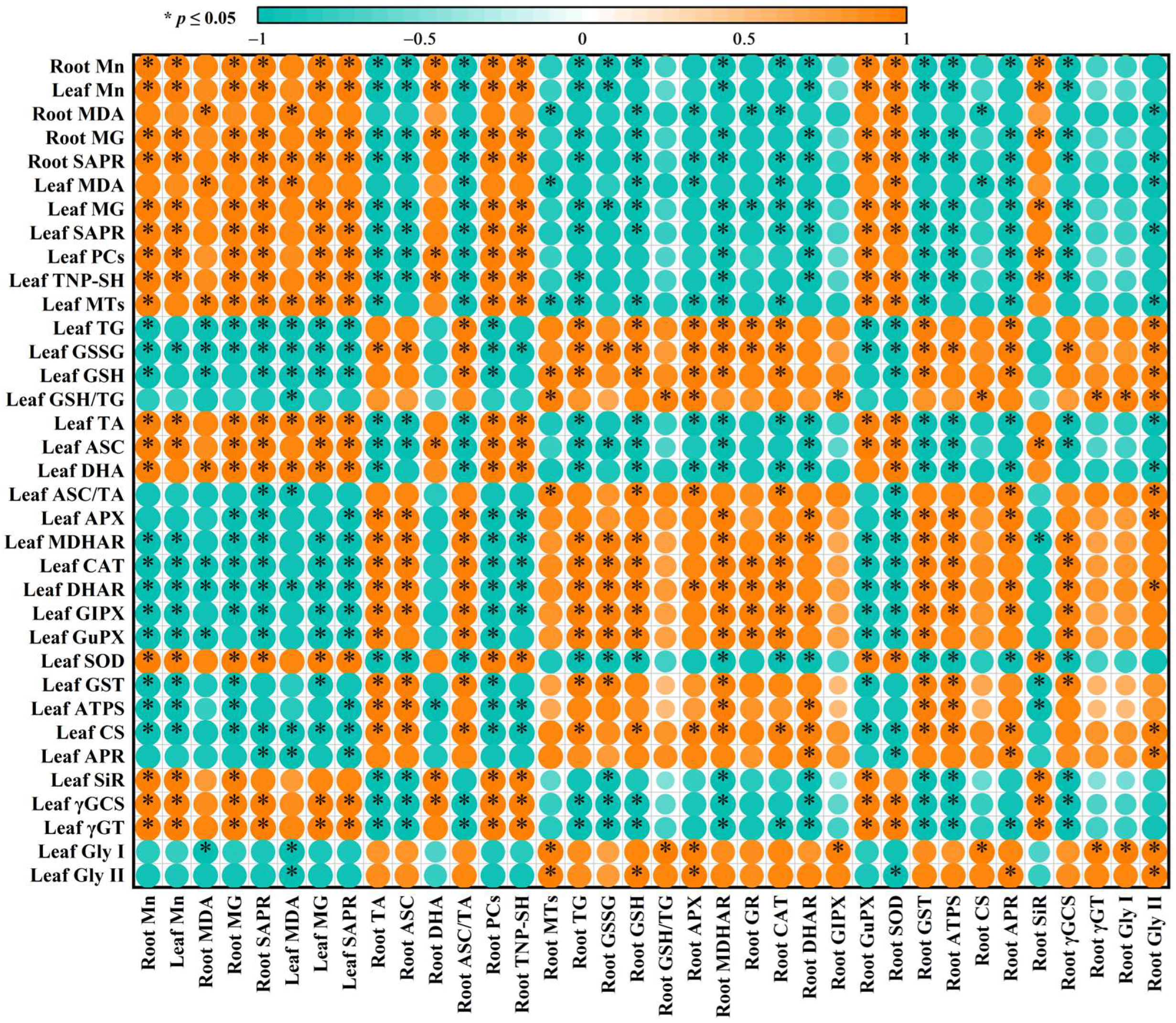 2.3. Principal Coordinate Analysis (PCoA), Regression Analysis, and Different Responses of Root and Leaf ROS and MG Formation and Detoxification to Mn–pH Treatments