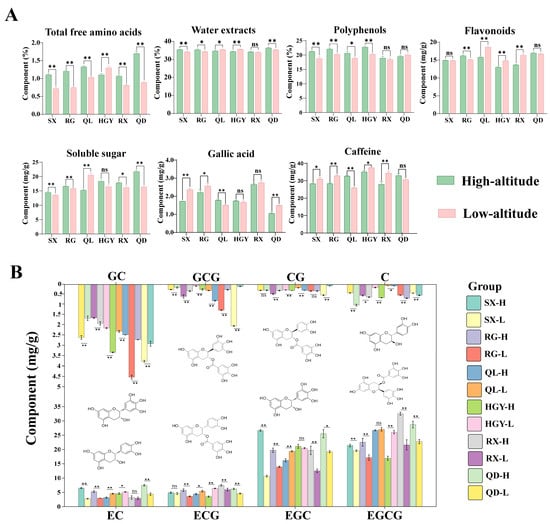 Effects of altitude on major quality-related compounds and catechin profiles in six oolong tea cultivars: comparison of macro-compositions (total free amino acids, water extracts, polyphenols, flavonoids, soluble sugar, gallic acid and caffeine) (A); comparison of catechin compositions (GC, GCG, CG, C, EC, ECG, EGC, EGCG) (B). Data are presented as mean ± standard deviation (n = 3). Significant differences between groups were determined by independent-samples t-test. * indicates p < 0.05, ** indicates p <0.01, "ns" indicates no significant difference.