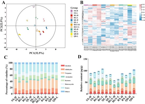 Detection and Analysis of Volatile Organic Compounds in Six Oolong Tea Cultivars at High and Low Altitudes: the PCA score plot of volatile organic compounds (A); cluster heatmap analysis of volatile organic compounds (B); proportion of volatile organic compound classification (C); relative content of volatile organic compounds (D).