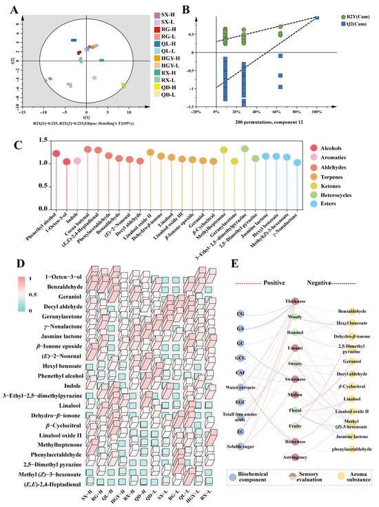 Multivariate Statistical Analysis and Key Volatile Organic Compounds of Six Oolong Tea Cultivars Grown at High and Low Altitudes: PLS-DA score plot of volatile compounds in 12 tea samples (A); permutation test for validating the PLS-DA model (B); volatile organic compounds with VIP values greater than 1 (C); heatmap of differential volatile organic compounds (VIP > 1 and rOAV > 1) between high- and low- altitude teas (D); correlation network illustrating the relationships among biochemical components, aroma substances, and sensory attributes (E).