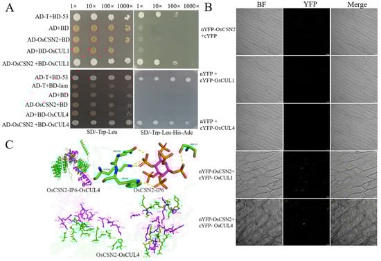 CSN interacts with Cullin through CSN2, participating in Cullin-mediated ubiquitination reactions. In human cells, the binding site of CSN2 with Cullin has been characterized using cryo-electron microscopy [4,31]. However, there have been no related reports in rice. Co-transformation of prey vector OsCSN2 and bait vectors BD-OsCUL1 and BD-OsCUL4 into AH109 yeast competent cells was performed. On SD/-Trp/-Leu plates, all yeast strains grew normally. Subsequently, positive yeast clones were serially diluted and spotted onto SD/-Ade/-Trp/-Leu/-His/3-AT plates. Apart from the positive control (pGADT7-T + pGBKT7-53), OsCSN2 was found to interact with OsCUL1 and OsCUL4 (Figure 1A). The interaction was further validated by Bimolecular Fluorescence Complementation (BiFC) assays. Construct pairs nYFP-OsCSN2/cYFP-OsCUL1 and nYFP-OsCSN2/cYFP-OsCUL4 were co-transformed into Agrobacterium tumefaciens EHA105 competent cells. After infiltration into the inner epidermal cells of red onion, significant yellow fluorescence was observed under a laser confocal microscope for both nYFP-OsCSN2 + cYFP-OsCUL1 and nYFP-OsCSN2 + cYFP-OsCUL4 treatments. In contrast, no yellow fluorescence was detected in any other treatment groups (Figure 1B).