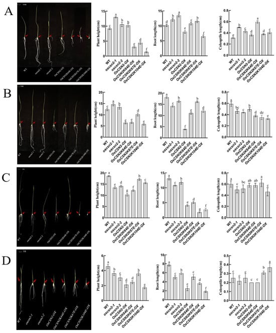 Phenotypic analysis, plant height, root length, and coleoptile length of oscsn2 under natural light and red light conditions. (A) Natural light treatment; (B) Red light treatment; (C) Red light and GA3 combined treatment; (D) Red light and PAC combined treatment. The red arrow indicates the position of the coleoptile. Lowercase letters indicate significant differences (p < 0.05).