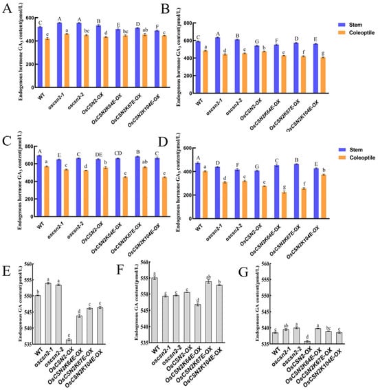 Analysis of endogenous GA3 content in oscsn2 under red and far-red light conditions. (A) Natural light treatment; (B) Red light treatment; (C) Red light and GA3 combined treatment; (D) Red light and PAC combined treatment; (E) Far-red light treatment; (F) Far-red light and GA3 combined treatment; (G) Far-red light and PAC combined treatment. In (A–D), uppercase letters indicate significant differences in GA3 content in rice stems (p < 0.05); lowercase letters indicate significant differences in GA3 content in rice coleoptiles (p < 0.05); in (E–G), lowercase letters indicate significant differences in GA3 content in rice stems (p < 0.05).