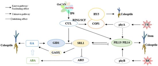 Under low GA conditions, OsSLR1 accumulates and promotes the degradation of PIFs through CRL complexes, thereby facilitating hypocotyl elongation. In addition, OsSLR1 can directly interact with PIF proteins, suppressing their transcriptional activity and rendering PIFs functionally inactive [33,34]. By contrast, when GA levels increase, GID1 binds OsSLR1 to form the GID1–GA–SLR1 complex, which triggers rapid ubiquitination and proteasome-mediated degradation of OsSLR1. The removal of OsSLR1 subsequently releases PIF activity, resulting in the inhibition of hypocotyl elongation.