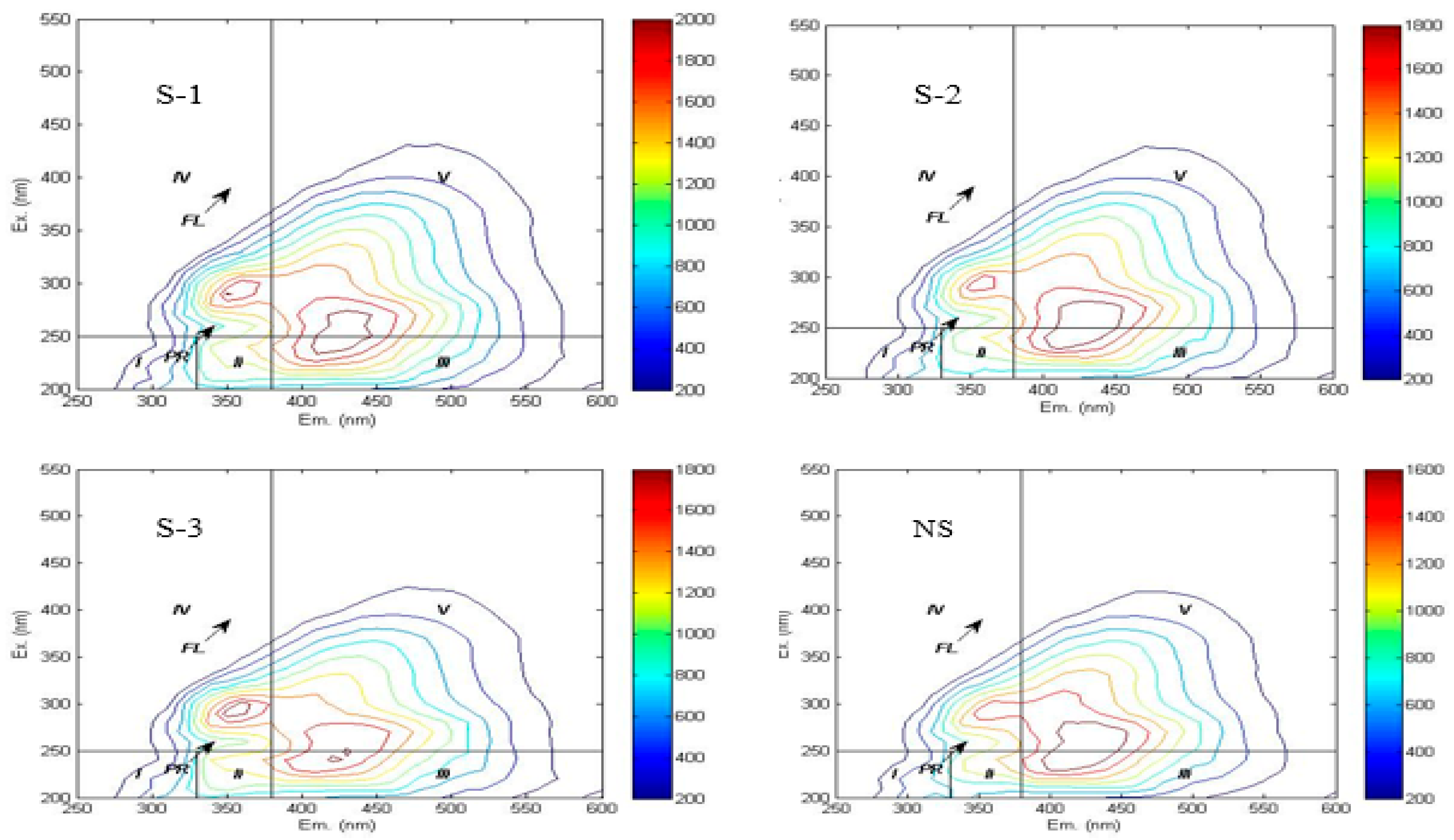 | Treatments | I Tyrosine-Like Protein | II Tryptophan-Like Protein | III Fulvic Acid-Like | IV Soluble Microbial Metabolites | V Humic Acid-Like |