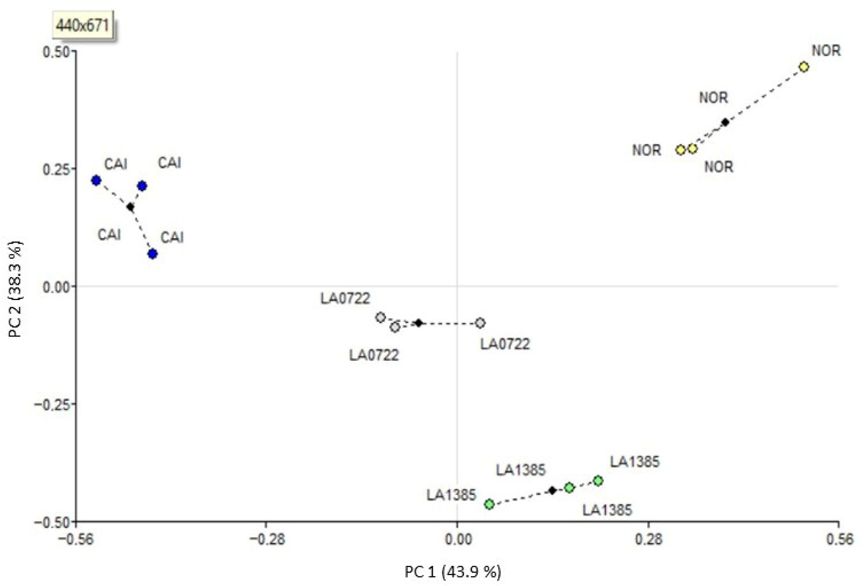 2.2. Association Analysis by Generalized Procrustes Among cDNA-AFLP Expression Profiles and Traits Related to Fruit Ripening and Identification of the Most Discrepant Genotype