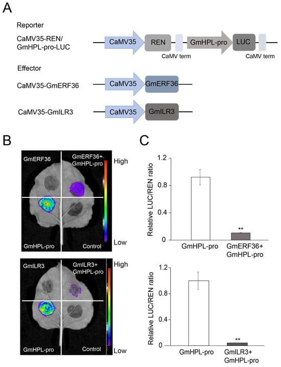 GmERF36 and GmILR3 inhibit the protein levels of GmHPL. (A) Schematic diagram of reporter and effector vectors used for dual-luciferase assays. (B) Representative dark-field images of transiently expressed LUC-empty vector and 35S-GmERF36 (GmERF36); LUC-empty vector and 35S-GmILR3 (GmILR3); GmHPL-pro-LUC (GmHPL-pro); 35S-GmERF36 and GmHPL-pro-LUC (GmERF36 + GmHPL-pro); 35S-GmILR3 and GmHPL-pro-LUC (GmILR3 + GmHPL-pro); and LUC-empty vector and 35S-empty vector (control) in tobacco leaves, showing GmERF36 and GmILR3 suppression of GmHPL. (C) The corresponding relative LUC/REN activity ratio. ** indicates significant differences at p < 0.01.