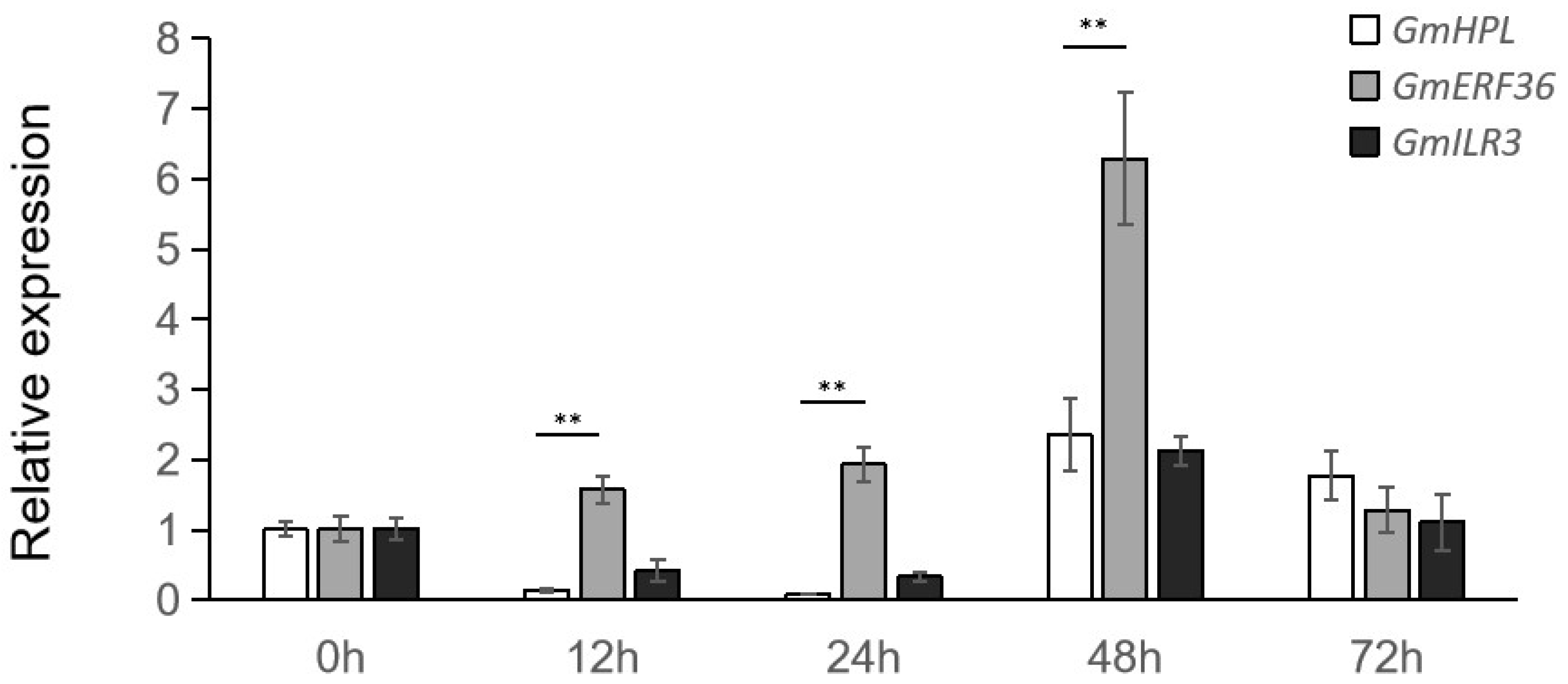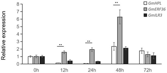 Relative expression level analyses of GmHPL, GmERF36, and GmILR3 in Williams82 at different times post-inoculation with C. truncatum. Student’s t-test was used for the comparisons of three biological replicates, and ** indicates differences at p < 0.01.