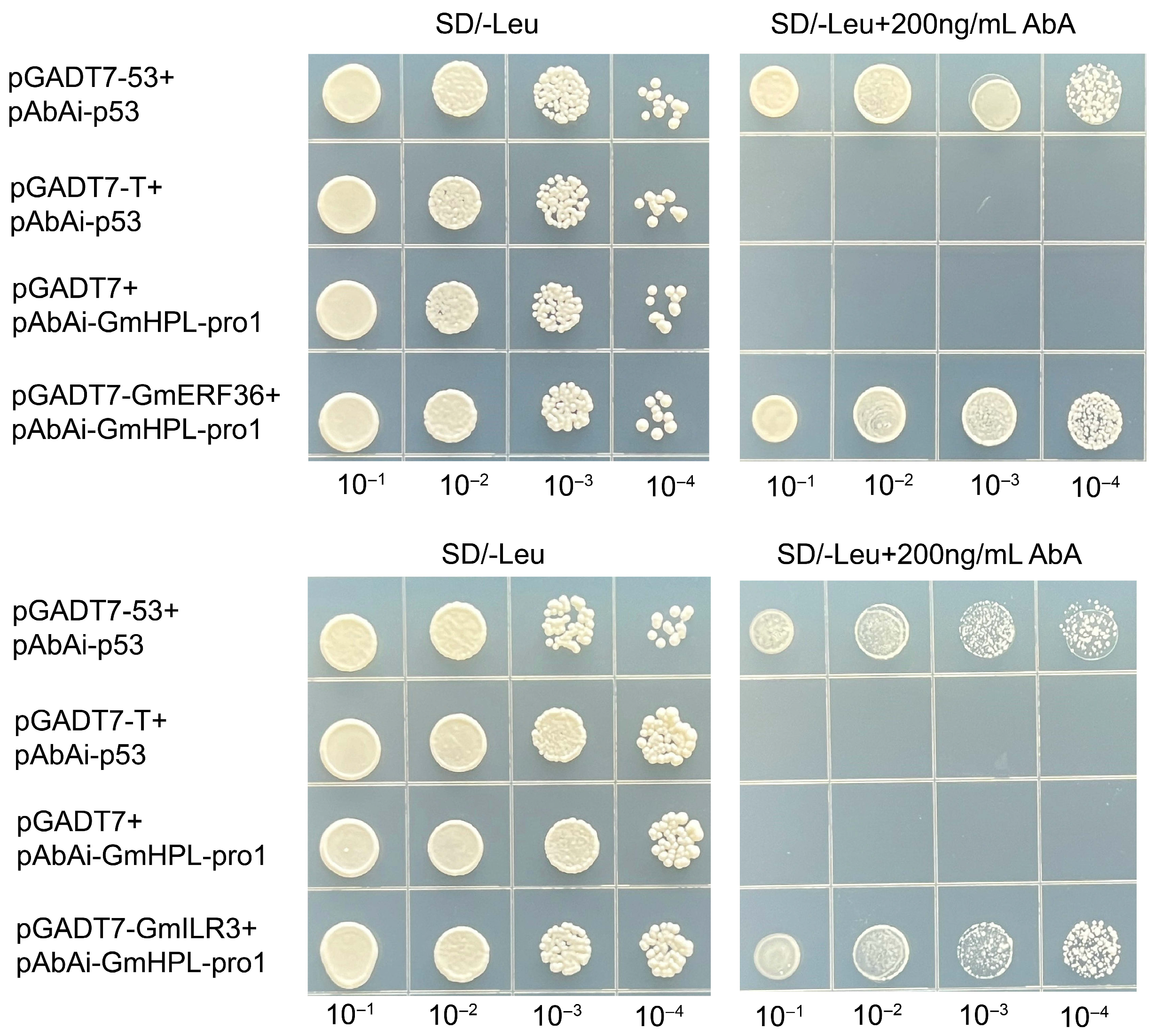 Yeast one-hybrid assay to detect interactions between GmHPL promoter and GmERF36 and GmILR3. The yeast strain of pGADT7-53+pAbAi-p53 was a positive control. The yeast strain of pGADT7-T+pAbAi-p53 or pGADT7-T+pAbAi-GmHPL-pro1 was the negative control. The yeast strains of pGADT7-GmERF36+pAbAi-GmHPL-pro1 and pGADT7-GmILR3+pAbAi-GmHPL-pro1 were the experimental groups. All yeast strains were selected on SD/-Leu media at different Aureobasidin A (AbA) concentrations (0 and 200 ng/mL). The numbers (10−1, 10−2, 10−3, and 10−4) at the top represent the dilution ratios of the yeast solution.