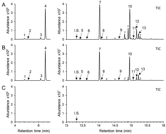 Headspace volatile terpenoids emitted from methyl jasmonate (MJ)-treated lettuce (Lactuca sativa cv. Salinas) seedlings. Only aerial part (approx. 1 g FW) was harvested from 10-day-old lettuce seedlings and enclosed in a glass vial (20 mL) at 12 h after MJ treatment with (A) 1 mM, (B) 0.5 mM, and (C) Mock (2% ethanol in water). The volatiles were analyzed by solid-phase microextraction-gas chromatography-mass spectrometry (SPME-GC-MS). Each peak was identified using authentic standards, Wiley Registry (12th edition) and the 2020 NIST library. 1, sabinene; 2, β-myrcene; 3, D-limonene; 4, β-ocimene; 5, guaia-4,11-diene; 6, copaene; 7, (E)-β-caryophyllene; 8, 10,10-dimethyl-2,6-dimethylenebicyclo[7.2.0] undecane; 9, (E)-α-farnesene; 10, caryophyllene oxide; 11, humulene epoxide; 12, 11,11-dimethyl-4,8-dimethylenebicyclo[7.2.0]undecan-3-ol; 13, hydroxycaryophyllene; and *, unknown terpenoid. Three biologically independent samples were analyzed and a representative chromatogram with similar results is shown. I.S.—Internal standard (1-bromodecane).