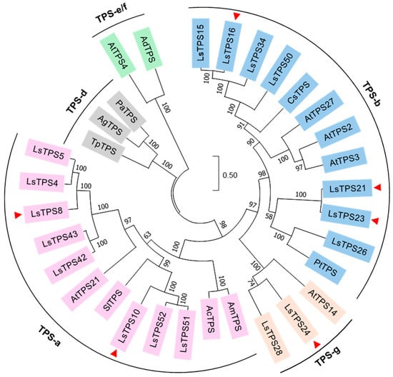 Phylogenetic analysis between lettuce TPSs and known TPSs in plants. A maximum-likelihood phylogenetic tree was generated using MEGA11 with a bootstrap value of 1000. Each TPS subgroup is shaded in different colors. Seventeen MJ-inducible TPSs in lettuce are considered to construct the tree. A red triangle represents the six TPSs biochemically characterized in this study. Abbreviations: Ls, Lactuca sativa; Pt, Populus trichocarpa; Pa, Picea abies; Ad, Actinidia deliciosa; Ac, Aquilaria crassna; Sl, Solanum lycopersicum; Am, Aquilaria malaccensis; Cs, Cannabis sativa; Ag, Abies grandis; Tp, Thuja plicata; and At, Arabidopsis thaliana.