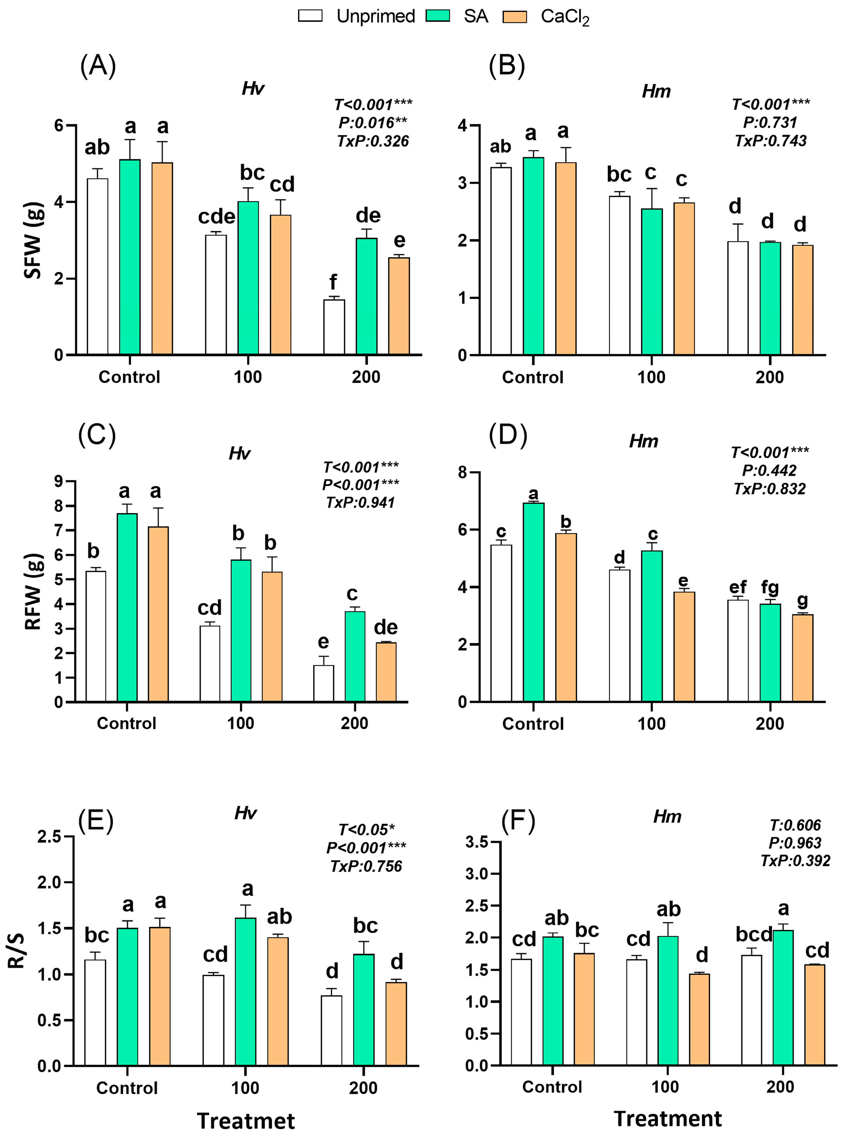 - Ellouzi, H.; Zorrig, W.; Amraoui, S.; Oueslati, S.; Abdelly, C.; Rabhi, M.; Siddique, K.H.M.; Hessini, K. Seed Priming with salicylic acid alleviates salt stress toxicity in barley by suppressing ROS accumulation and improving antioxidant defense systems, compared to halo- and gibberellin priming. Antioxidants 2023, 12, 1779. [Google Scholar] [CrossRef]