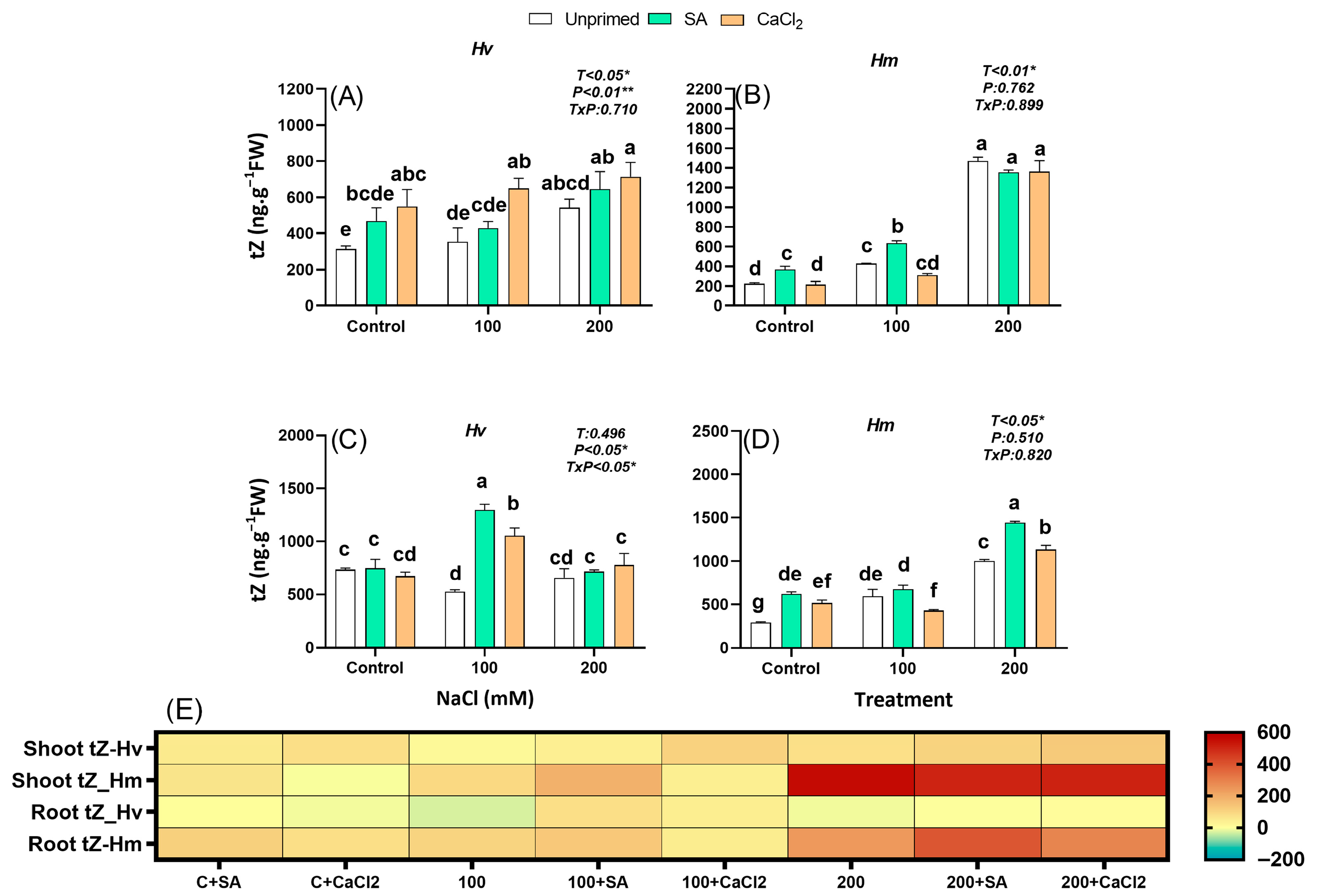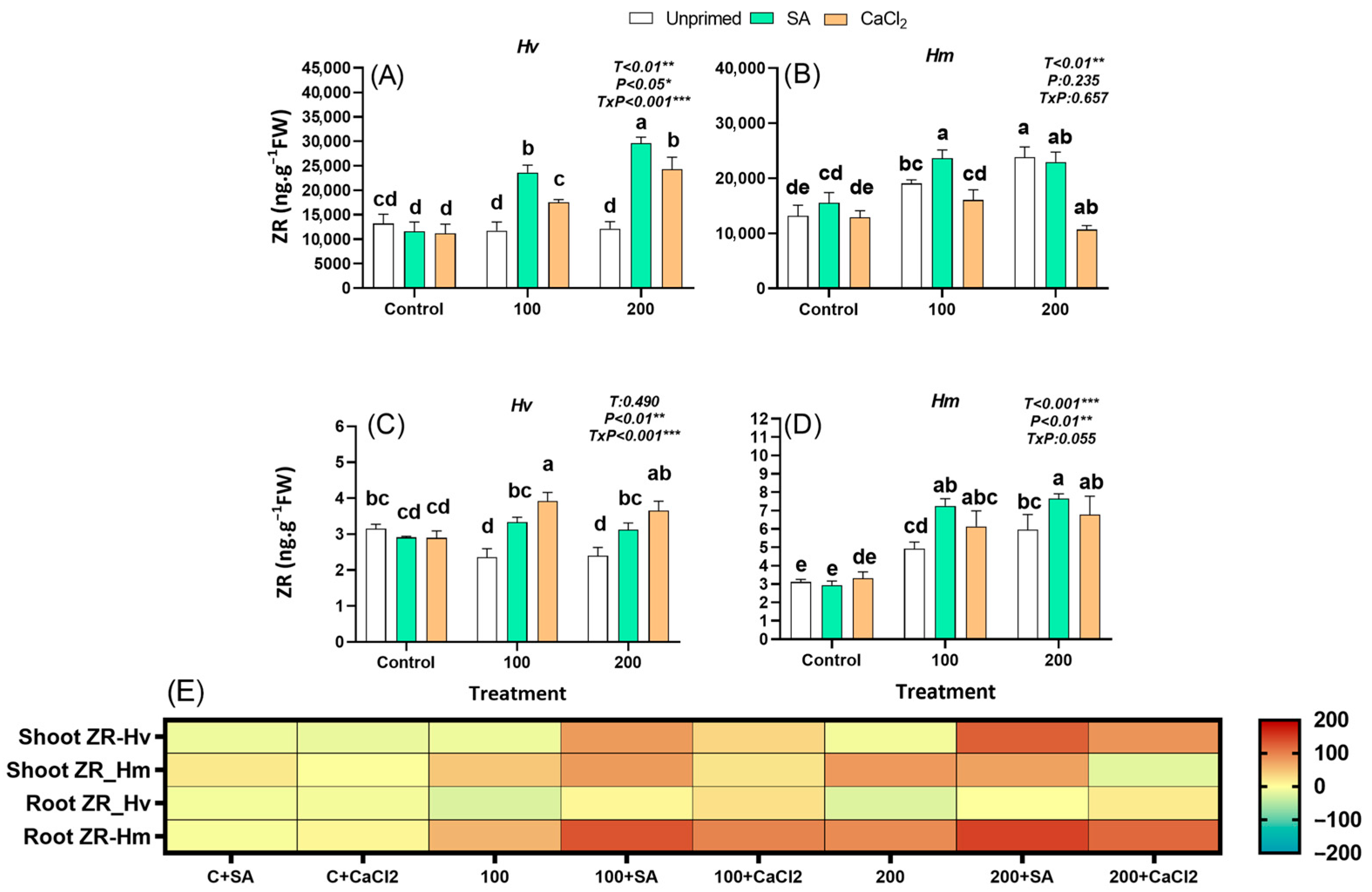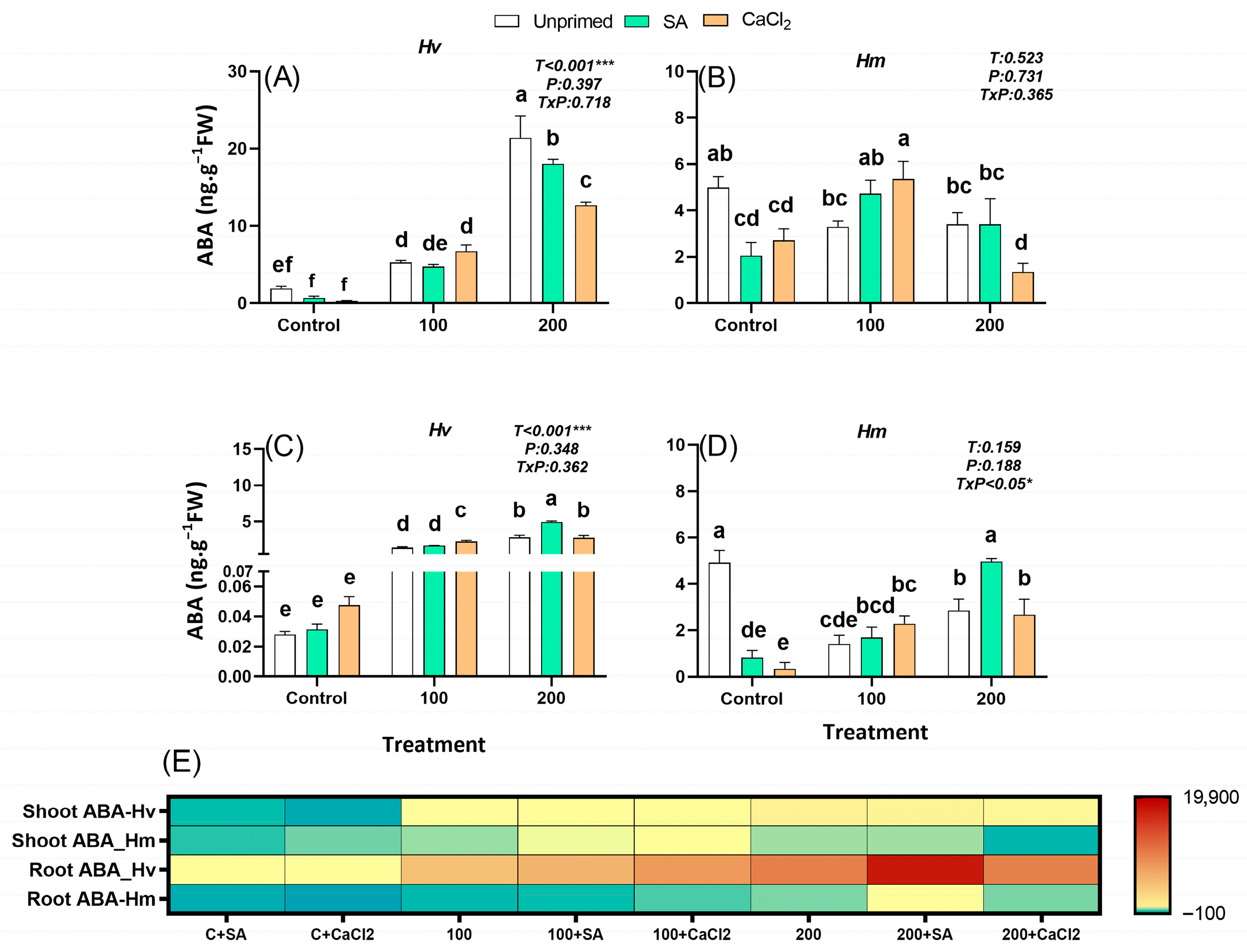 APA StyleBen Youssef, R., Jelali, N., Martínez-Melgarejo, P. A., Albacete, A., Abdelly, C., Pérez-Alfocea, F., & Martínez-Andújar, C. (2026). Growth and Hormonal Responses to Salicylic Acid and Calcium Chloride Seed Priming in Domestic and Wild Salt-Tolerant Barley Species Under Saline Conditions. Plants, 15(1), 64. https://doi.org/10.3390/plants15010064