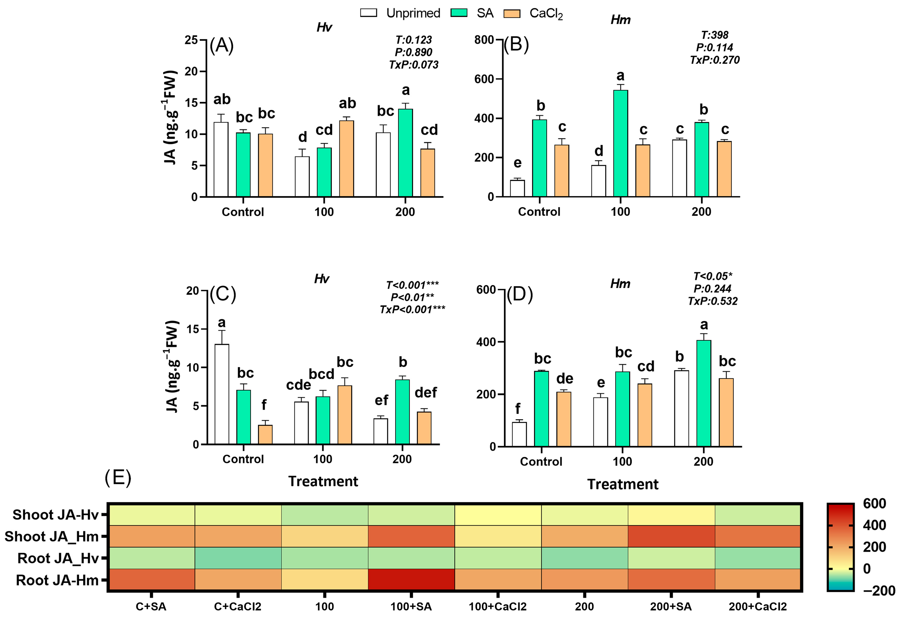 - Ben-Youssef, R.; Jelali, N.; Martínez-Andújar, C.; Abdelly, C.; Hernández, J.A. Salicylic acid and calcium chloride seed priming: A prominent frontier in inducing mineral nutrition balance and antioxidant system capacity to enhance the tolerance of barley plants to salinity. Plants 2024, 13, 1268. [Google Scholar] [CrossRef]
