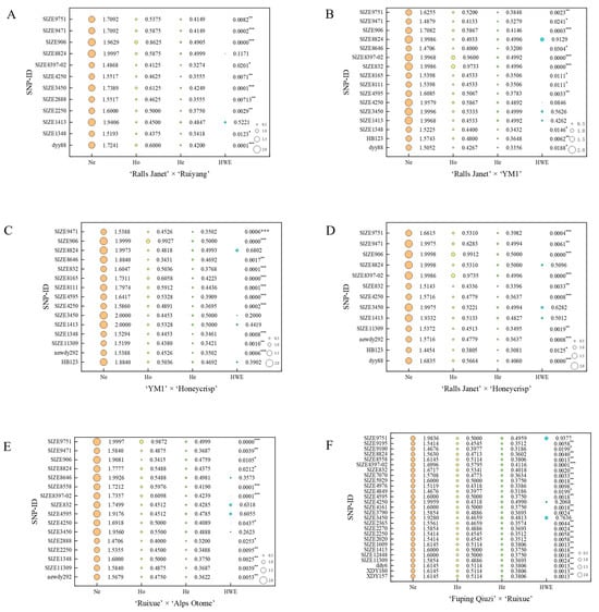SNP loci of each hybrid and their genetic diversity analysis. (A) ‘Ralls Janet’ × ‘Ruiyang’. (B) ‘Ralls Janet’ × ‘YM1’. (C) ‘YM1’ × ‘Honeycrisp’. (D) ‘Ralls Janet’ × ‘Honeycrisp’. (E) ‘Ruixue’ × ‘Alps Otome’. (F) ‘Fuping Qiuzi’ × ‘Ruixue’. Ne: the number of effective alleles; Ho: observed heterozygosity; He: expected heterozygosity; HWE: Hardy–Weinberg equilibrium p-value (* indicates p < 0.05, ** indicates p < 0.01, *** p < 0.001).