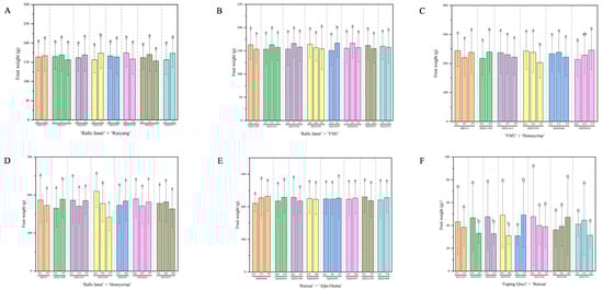 Significance analysis was conducted on phenotypic values associated with genotypes at loci exhibiting moderate polymorphism and conforming to HWE using IBM SPSS Statistics 20.0 (Table S4). To account for the multiple comparisons performed across all marker loci, the False Discovery Rate (FDR) was controlled using the Benjamini–Hochberg procedure. Marker trait association (MTA) significance was declared at BH-FDR adjusted q < 0.05; corresponding raw p-values and q-values are summarized in Table S7. The results showed that in RJ × RY (Figure 4A), there was a significant MTA (p < 0.05, q < 0.05) for locus SIZE2250, while there was no significant difference (p > 0.05) for SIZE1348 and the other six loci. In RJ × Y (Figure 4B), there was a significant MTA (p < 0.05, q < 0.05) for SIZE4595; taking SIZE1348 as an example, no significant associations (p > 0.05) were detected for SIZE1348 or the other 11 loci. In Y × H (Figure 4C), significant MTAs (p < 0.05, q < 0.05) were detected for SIZE11309, SIZE3450, and SIZE8824; no significant associations (p > 0.05) were found for HB123 or the other two loci. In RJ ×H (Figure 4D), significant MTA (p < 0.05) were detected for SIZE11309 and SIZE3450; no significant associations (p > 0.05) were found at five loci such as HB123. In RX × A (Figure 4E), none of the 13 loci tested showed significant MTAs. In Q × RX (Figure 4F), significant MTAs (p < 0.05, q < 0.05) were detected for 10 loci, ddy6, SIZE12448, SIZE4976, SIZE2020, SIZE9195, SIZE2250, SIZE2270, SIZE2365, SIZE3790, SIZE4161; no significant associations were found for the remaining 16 loci (e.g., SIZE1413, p > 0.05). Ultimately, the MTA loci constituted MTA-based marker combinations (Table S5). Genomic physical positions for all MTA-based SNPs are provided in Table S6 to facilitate downstream candidate-gene discovery.