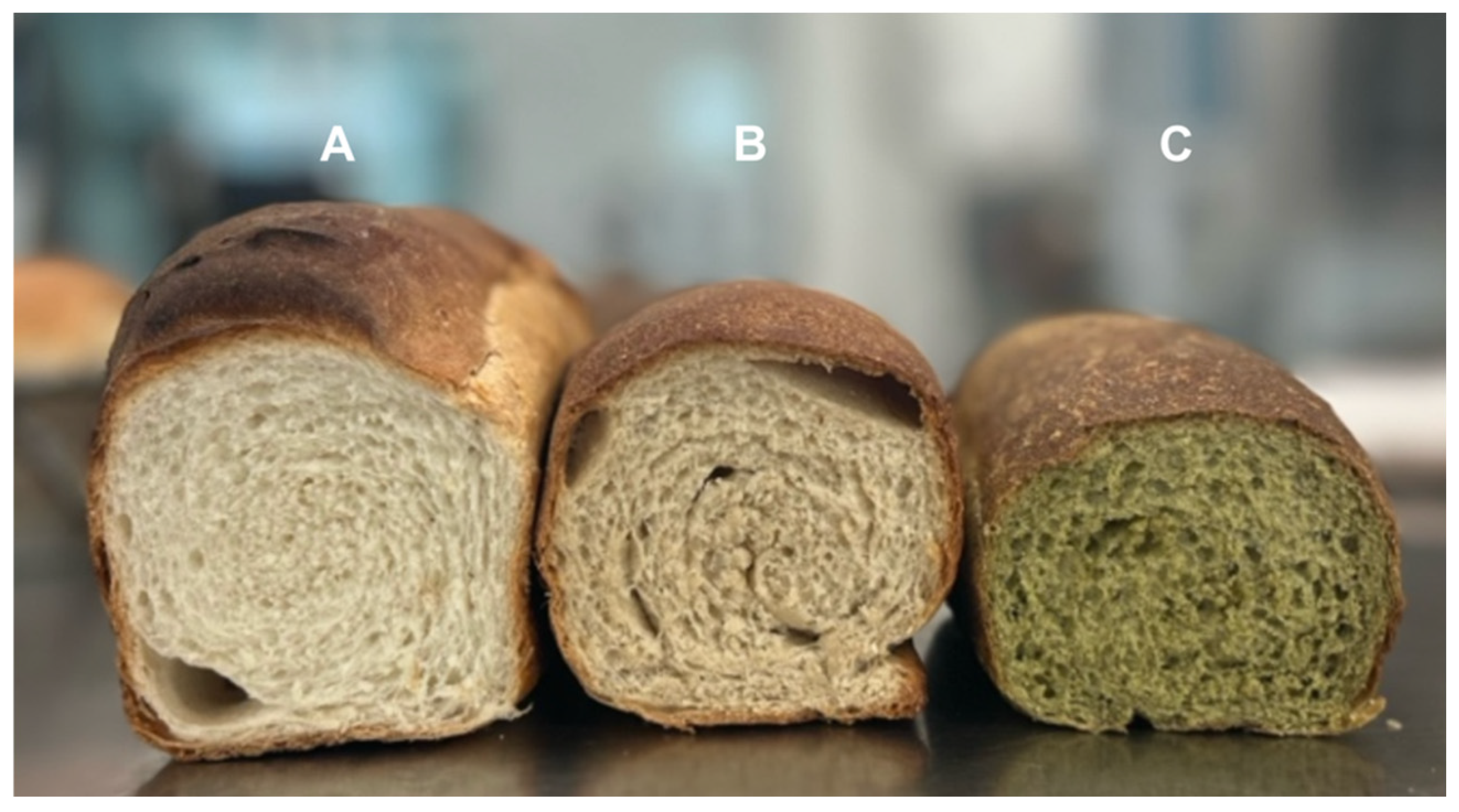 Table 3). The control bread exhibited a slightly lower final weight, consistent with greater moisture loss during baking. This behavior is expected for breads with higher loaf volume and a more open crumb structure, as greater gas expansion facilitates water evaporation during heating [