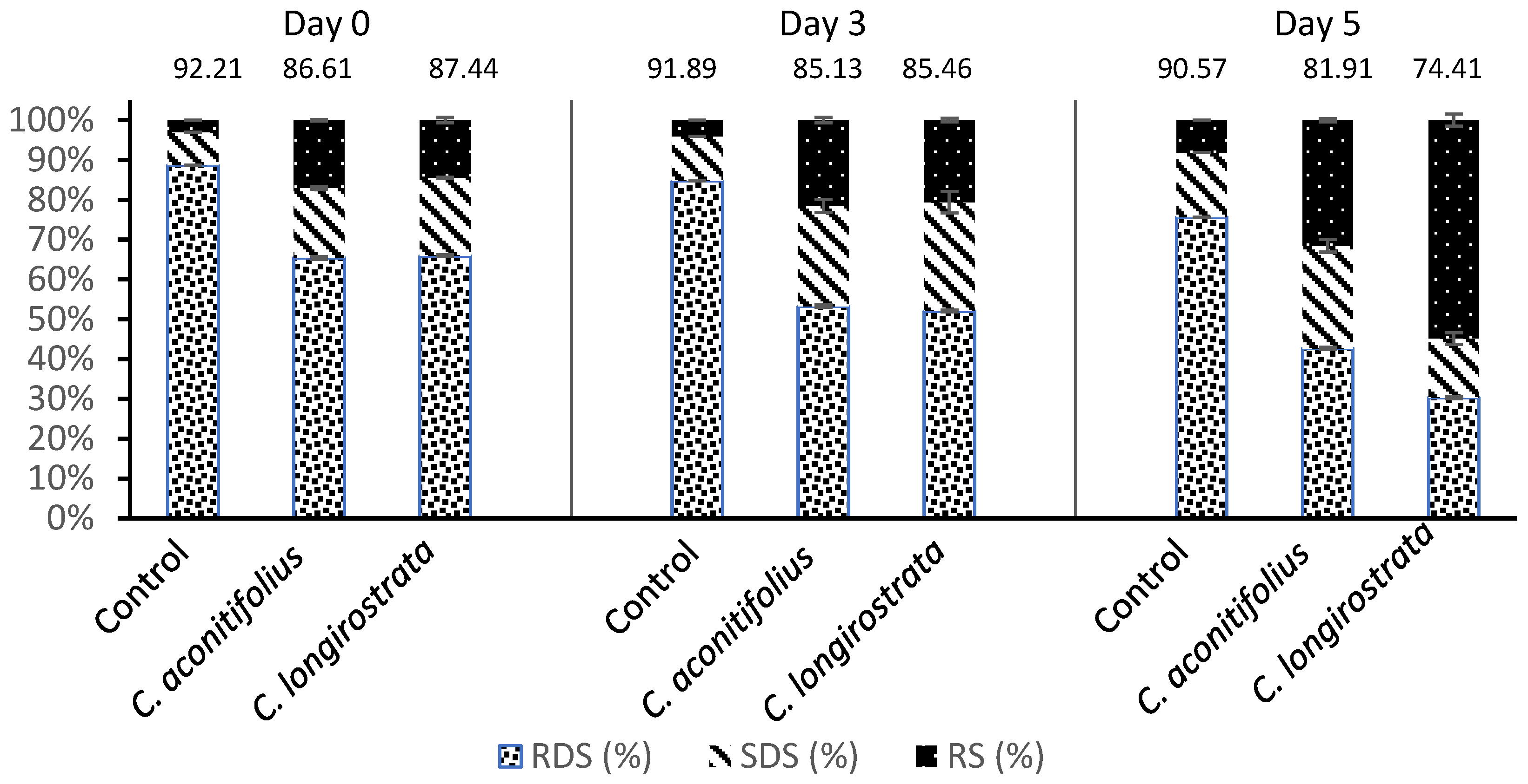 C. aconitifolius bread also showed an increase in RS over storage, reaching 31.56 ± 2.93% on Day 5 and reducing its pGI to 81.91 ± 0.97. Although less pronounced than
