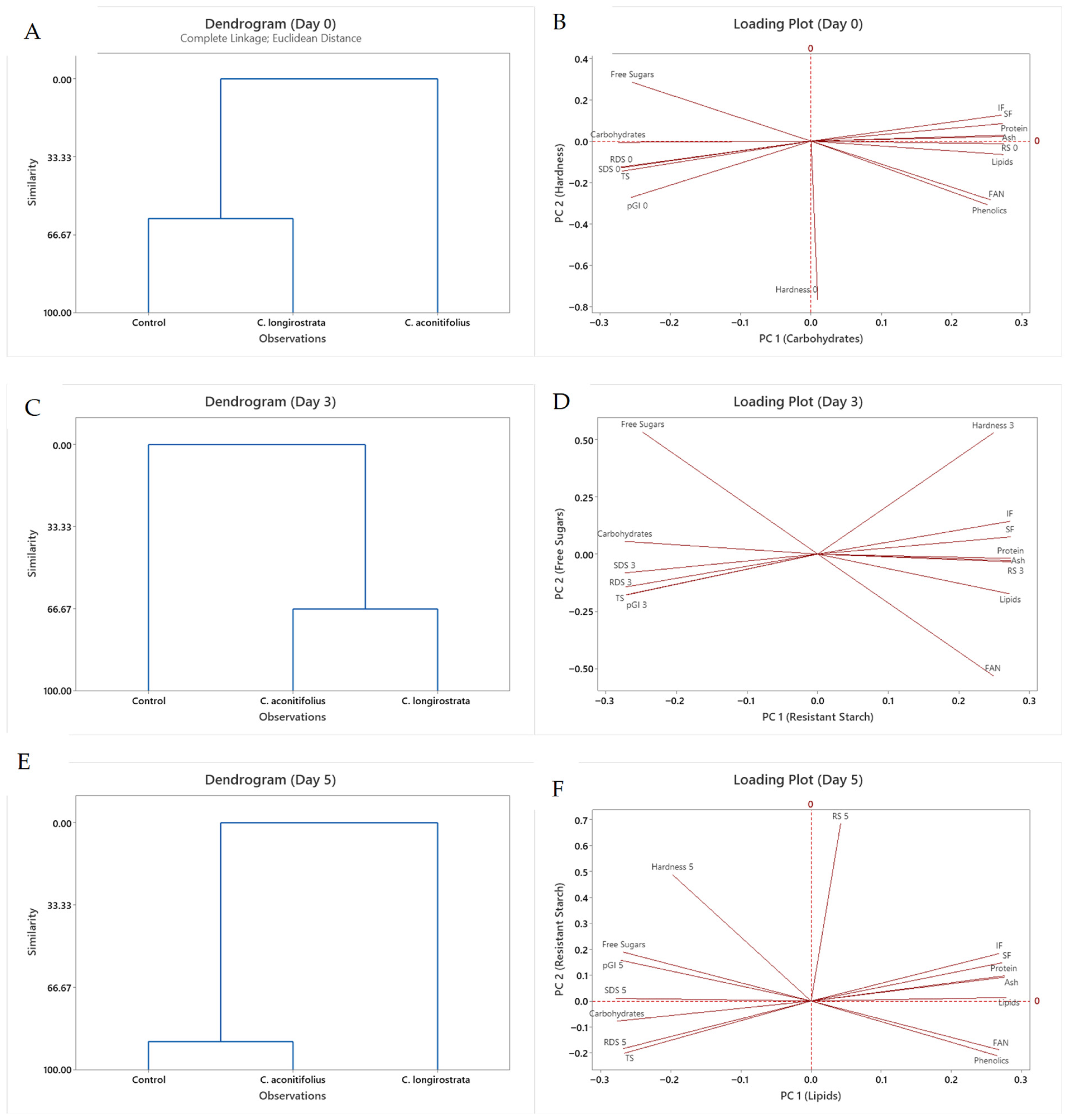 Across storage days, the control bread consistently separated from the plant-enriched samples, reflecting its higher starch digestibility and lower fiber and phenolic content. By contrast, C. longirostrata gradually separated from both the control and C. aconitifolius formulations, consistent with its distinct moisture retention, slower firming pattern, and greater accumulation of resistant starch. These qualitative groupings reinforce the main findings on technological performance and starch digestibility but do not provide additional mechanistic insights.