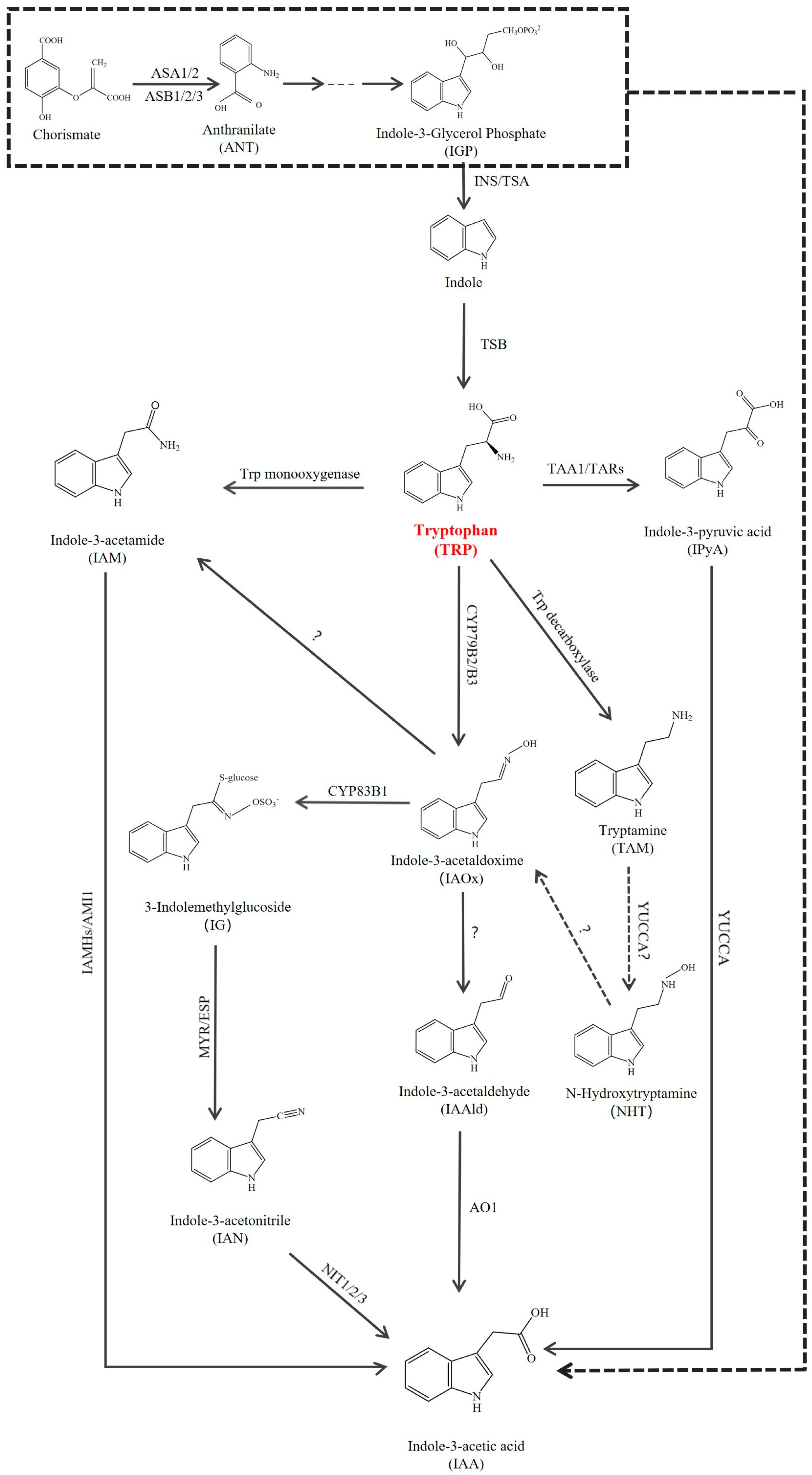 | TAA/TAR | Tryptophan Aminotransferase of Arabidopsis/Tryptophan Aminotransferase- Related | taa1 tar2 | taa1: shorter petioles and larger leaf area than WT under shade; disrupts root hair elongation under low phosphorus; root resistance to ethylene and N-1-Naphthylphtha-lamic acid(NPA); tar2: reduced lateral root number and density under low nitrate conditions | [53,54,55] |