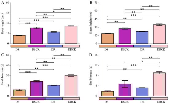 Furthermore, the intrinsic relationship between substance synthesis and consumption within the plant becomes disrupted, resulting in the reduction in plant biomass [29]. DR is significantly less affected by drought factors than DS. Notably, the extent of decrease in the dry weight index is greater for DR (65%) than for DS (60.8%). This phenomenon may be attributed to more extensive root growth experienced by DR under drought stress, which necessitates higher energy consumption during its initial stages [30].