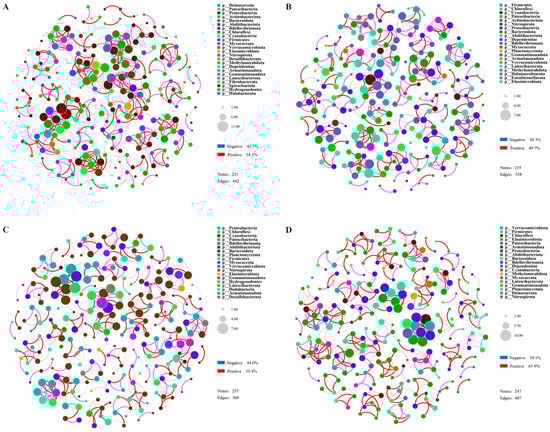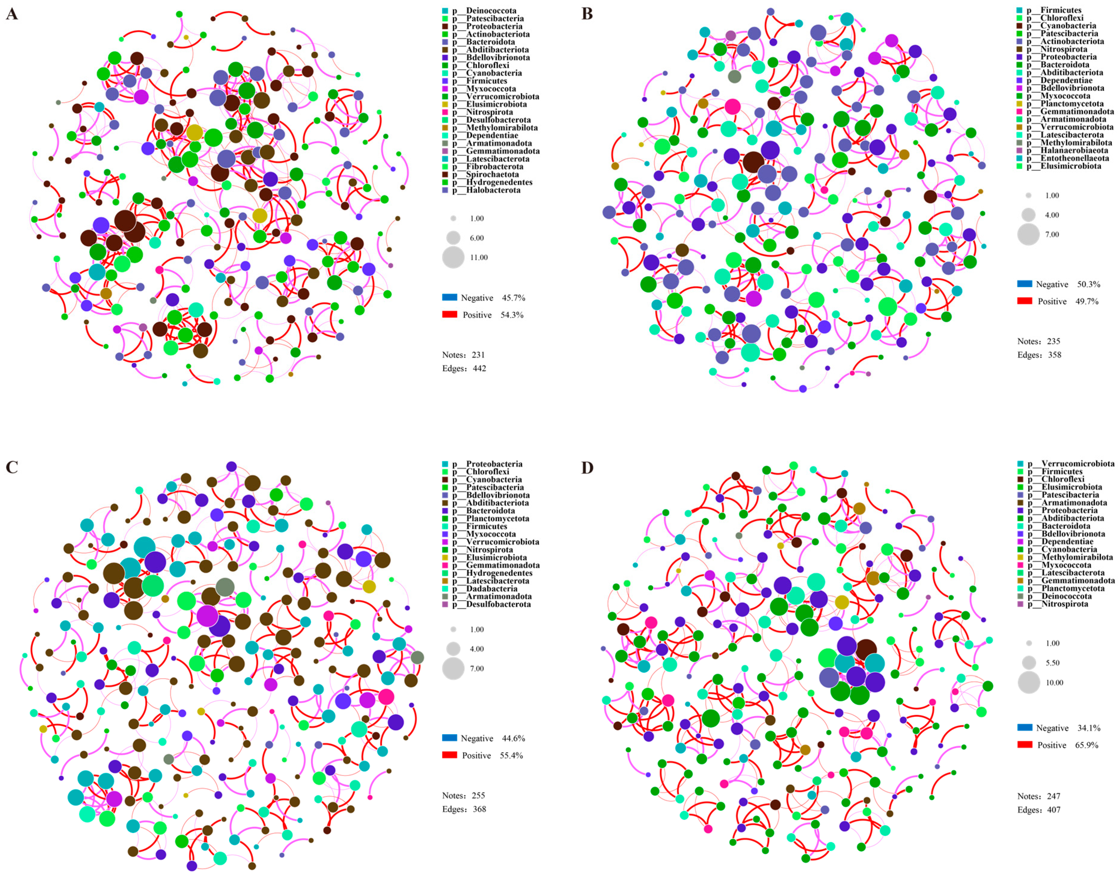 Network diagrams of rhizosphere bacteria under each treatment of DR (A), DRCK (B), DS (C), and DSCK (D). The size of the nodes in the figure represents species abundance, and different colors represent different species. The color of the connecting lines represents positive and negative correlations. Red lines indicate significant positive correlations, and pink lines indicate substantial negative correlations. The thickness of the lines represents the magnitude of the correlation coefficient, and Pearson correlation analysis was used. The default value of the correlation coefficient in the figure is p < 0.01. The number of lines indicates the closeness between nodes.