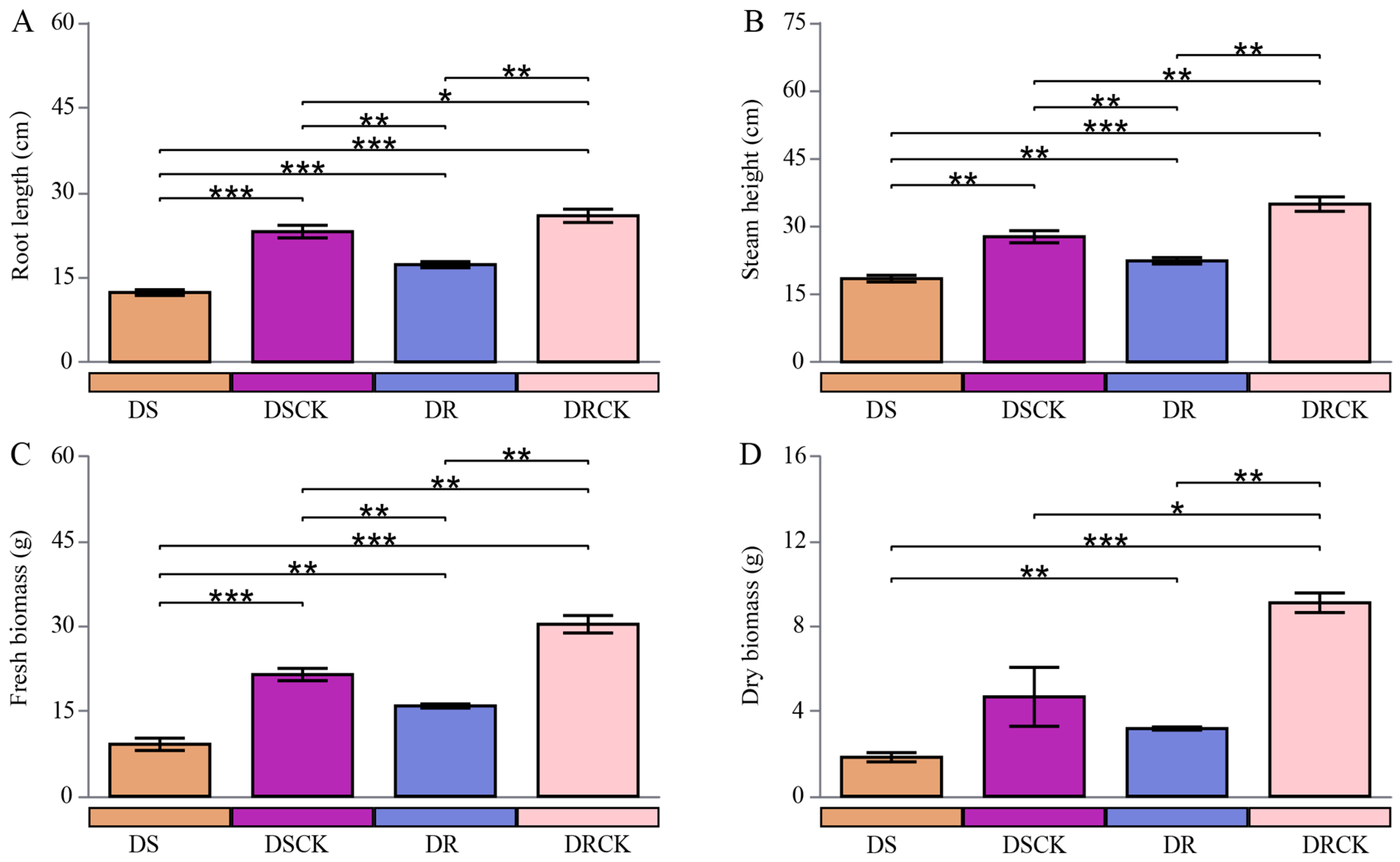 A distinct gradient relationship was evident among the four treatment groups across all growth indicators. The order of plant growth performance, from optimal to suboptimal conditions, was as follows: DRCK > DSCK > DR > DS. Under drought treatments, both citrus varieties exhibited significant growth inhibition; notably, the inhibitory effect induced by DS was markedly more pronounced than that of the DR group.