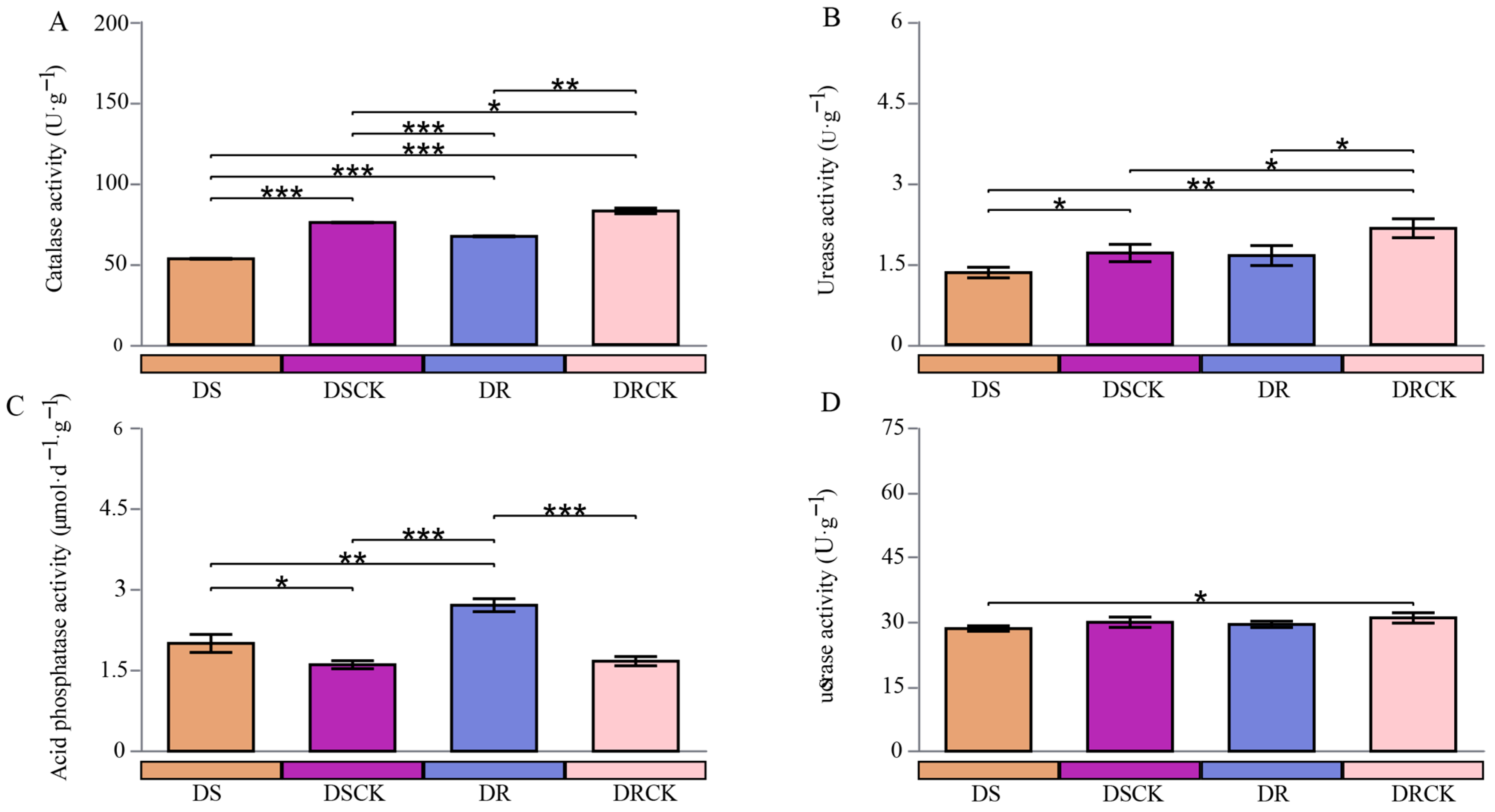 To gain an in-depth understanding of the effects of drought stress treatments on the rhizosphere microenvironments of various resistant varieties, this study assessed the activities of catalase (CAT), urease (UE), acid phosphatase (ACP), and invertase (SE) in the soil from each treatment group. The comparative analysis of soil enzyme activities in the DSCK and DRCK groups revealed that the activities of CAT, UE, and SE were significantly higher in the DRCK as compared to the DSCK group. This finding suggests that there are inherent differences in the soil biochemical environments between the two experimental systems under non-stress conditions. Conversely, the activities of acid phosphatase (ACP) had no significant differences (Figure 2).