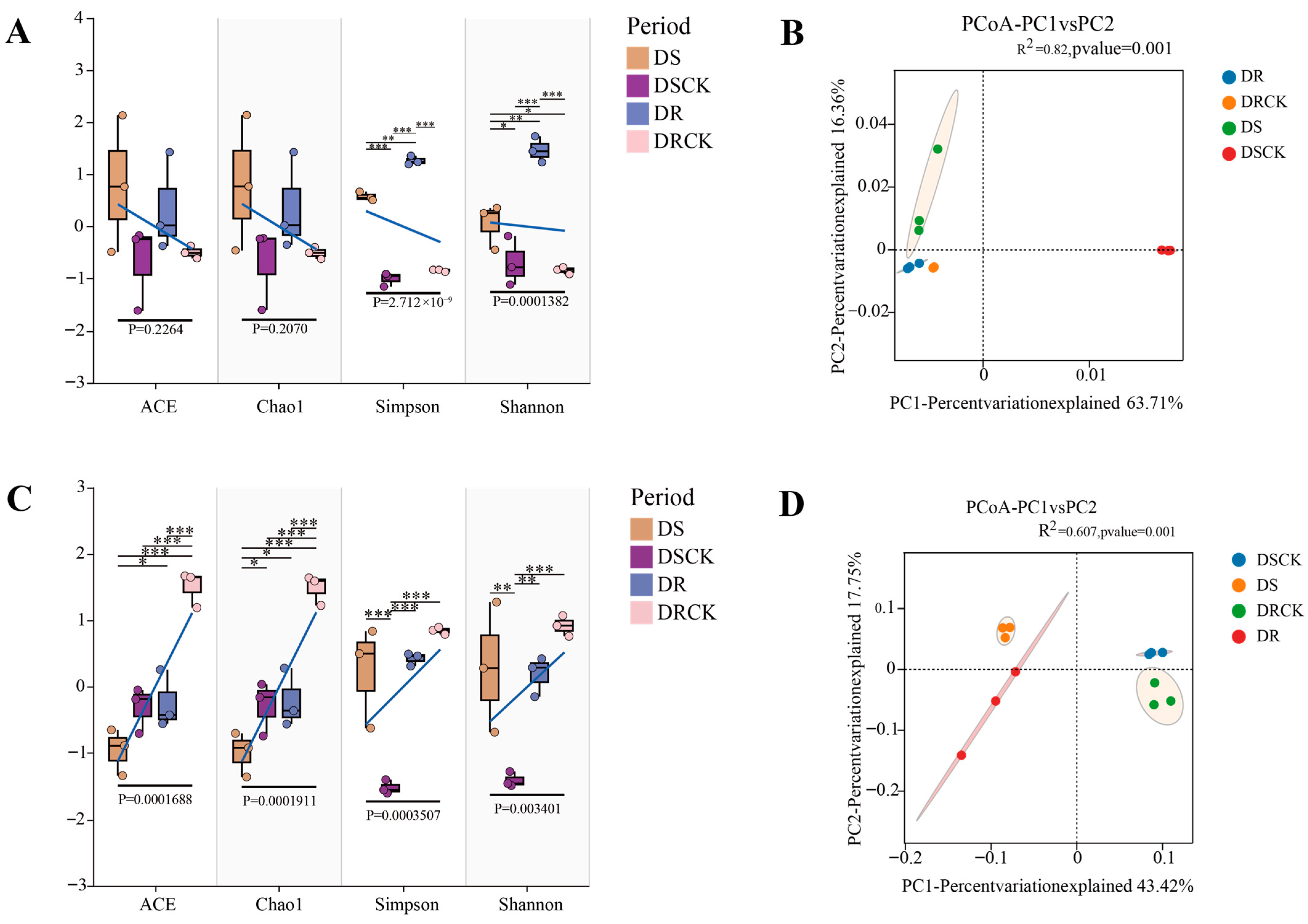 At the end of drought stress (day 20), plants with consistent growth conditions were selected from each group. For each of the four treatments, rhizosphere soil from three independent pots (each pot considered one biological replicate) was collected. Soil from each pot was homogenized, subsampled, and analyzed, resulting in n = 3 biological replicates per treatment. The root systems were dug out along with the surrounding soil, and large soil clumps and stones were removed. Loose soil was gently shaken off, and the rhizosphere soil adhering to the root surface was collected with a brush. Subsequently, these samples were passed through a 2 mm sieve and thoroughly mixed. Each processed soil sample was then evenly divided into three parts, resulting in 12 independent soil samples (n = 12). Each soil sample was split into two parts, placed in self-sealing bags, and then transported in a sample box with ice packs at low temperature to the laboratory. One part was stored in a 4 °C refrigerator for subsequent analysis of soil enzyme activity, microbial biomass, carbon and nitrogen content, and available nutrient content. The other part was stored at −80 °C for microbial diversity sequencing.