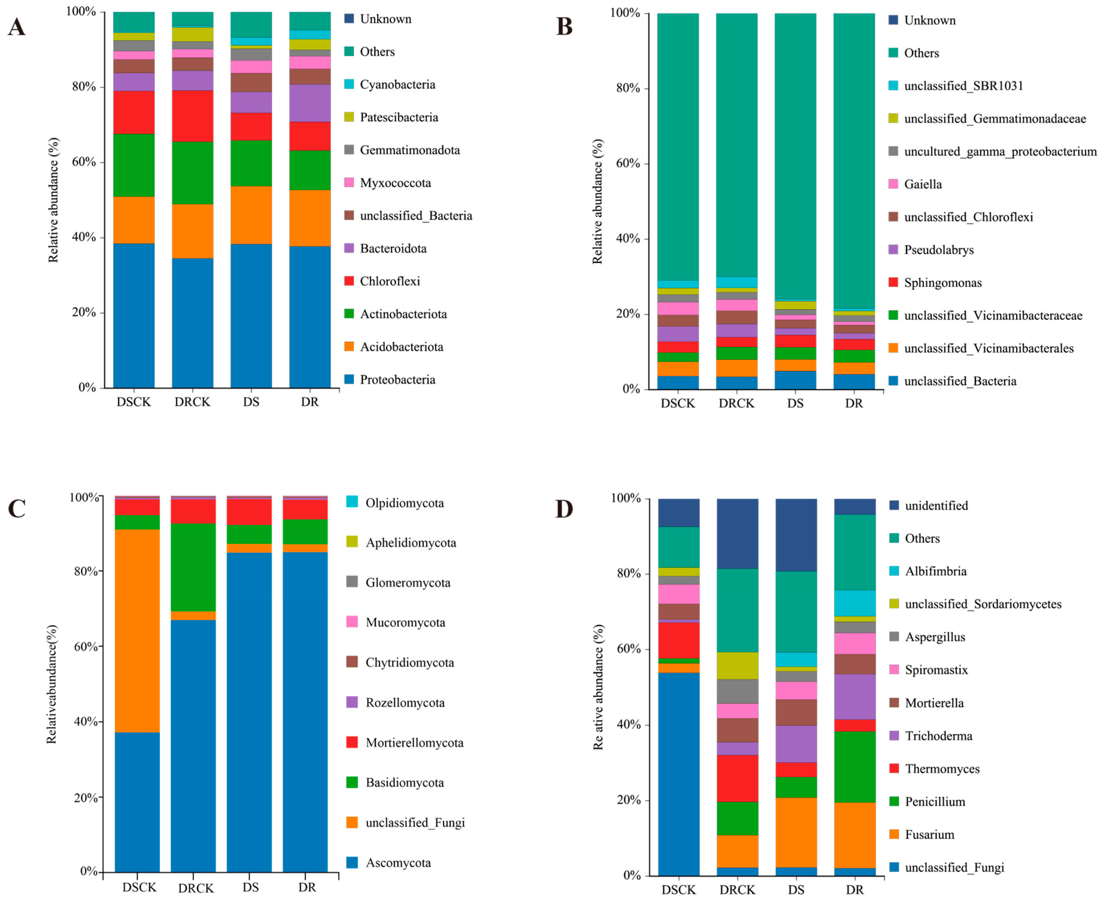 In the bacterial community compositions at the phylum level across each treatment group, Proteobacteria emerged as the predominant phylum. Its relative abundance exceeded 34% in all treatment groups, with minimal differences observed among them. The other principal phyla included Acidobacteriota, Actinobacteriota, and Chloroflexi. The combined relative abundance of these three phyla surpassed 30%. Notably, when compared to the control groups (DSCK and DRCK), the relative abundances of Actinobacteria and Chloroflexi in the treatment groups of DS and DR exhibited a declining trend. The relative abundance of Acidobacteriota showed a slight increase in these treatment groups. Moreover, there was a remarkable increase in the proportion of Bacteroidota within the DR group (9.97%), which was approximately 1.5 to 2.0 fold higher than other groups. Cyanobacteria also demonstrated significant increases in the DS and DR groups (Figure 5A). At the genus level, the bacterial community was predominantly composed of a substantial number of low-abundance species, with the proportion of the “Others” category exceeding 69.9% in all instances. Among the major identifiable genera, the relative abundances of Pseudolabrys and Gaiella in the DS and DR treatment groups were significantly lower than those of the control groups (Figure 5B).