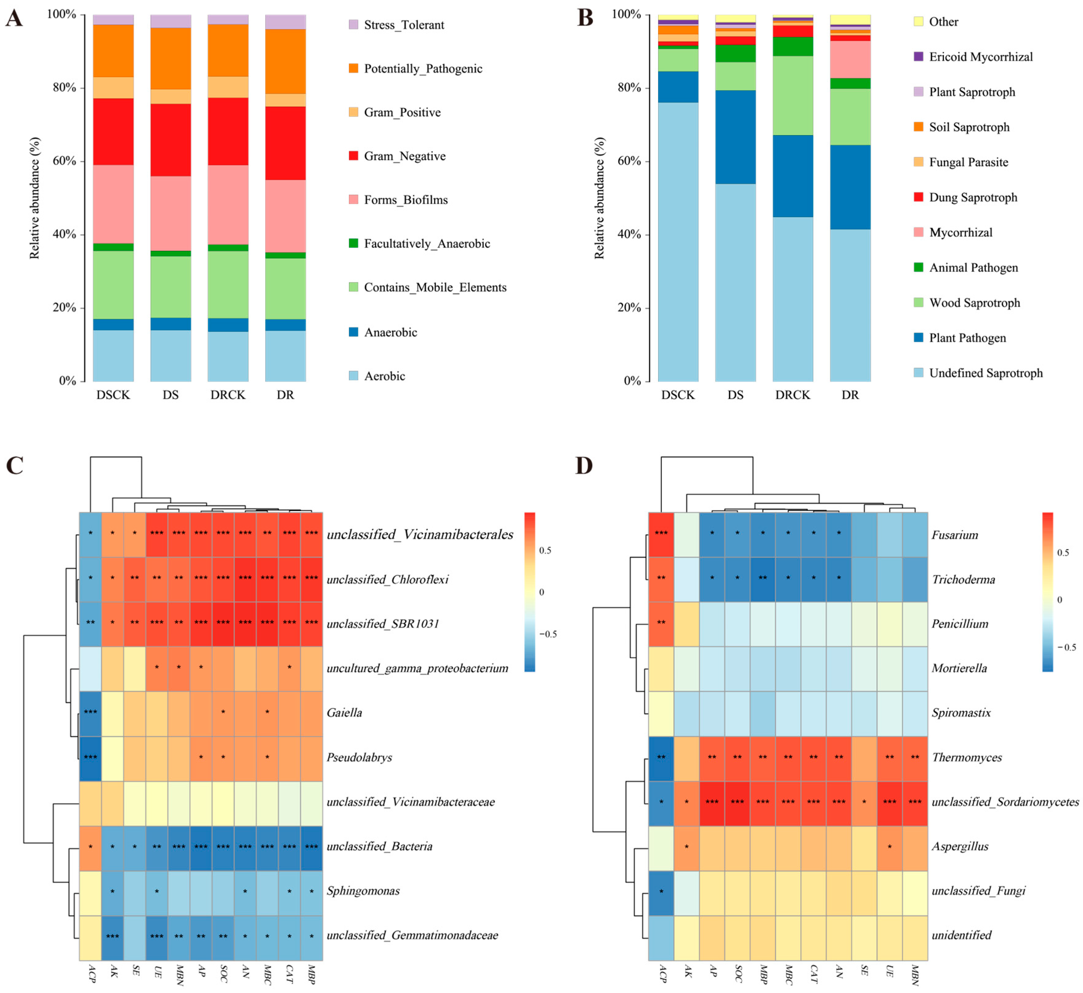 The fungal functional prediction results based on the FUNGuild database revealed that different treatments significantly modified the functional structure of the fungal community. As the most prevalent functional group, Undefined Saprotroph exhibited substantially lower relative abundance in the treatment groups (DS-54.0% & DR-41.5%) compared to the control groups (DSCK-76.2% & DRCK-44.9%). However, the functional abundance of plant pathogens increased substantially in the treatment groups. The abundances in the DS (25.4%) and DR (22.9%) groups were considerably higher than those in the corresponding control groups (DSCK, 8.4% & DRCK, 20.3%). Notably, Mycorrhizal fungi showed a remarkable enrichment in the DR group (10.2%), while their abundances were nearly negligible in the other groups (<0.1%). This represents one of the most unique functional features of the DR treatment (Figure 7B).