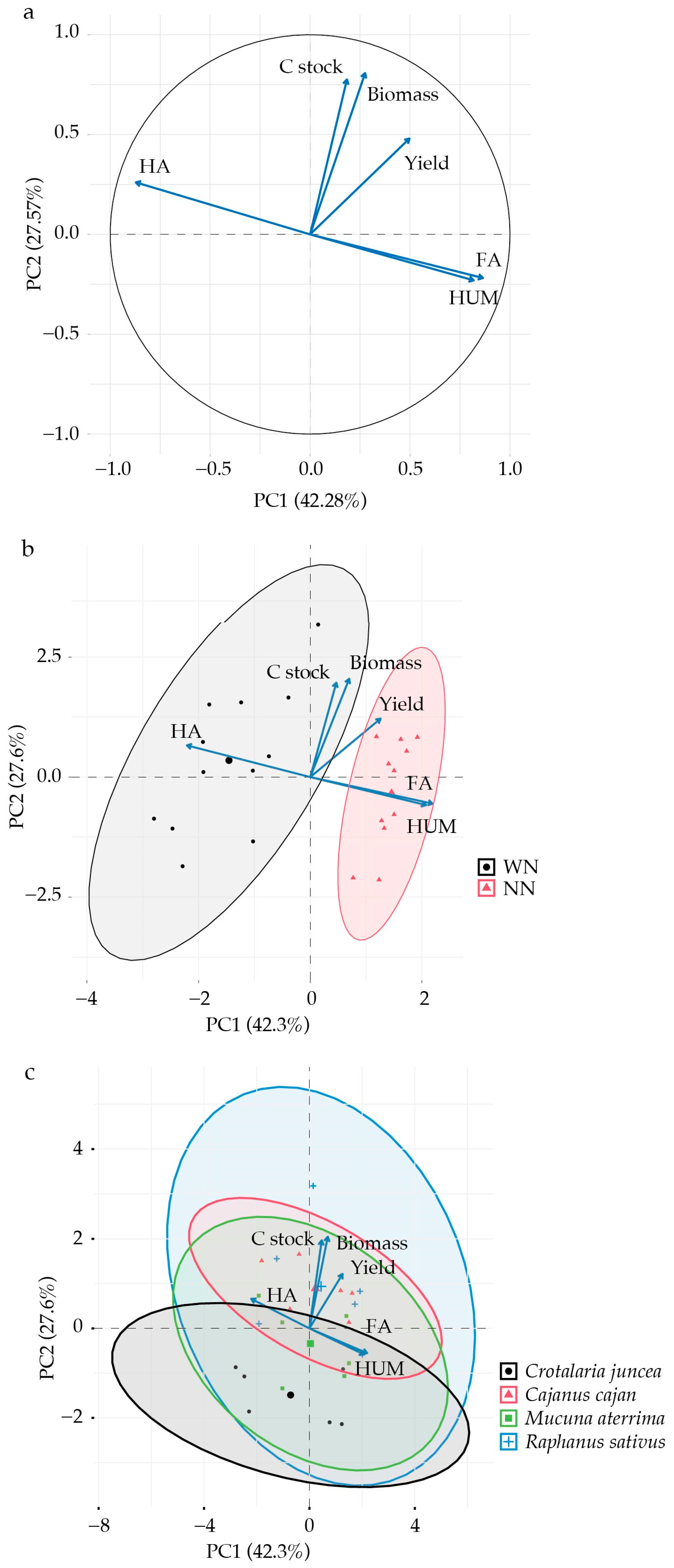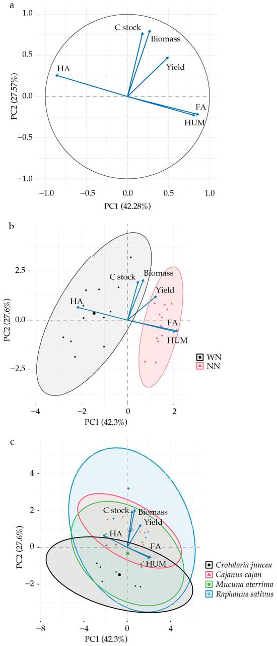 Principal component analysis (PCA) was used to explore relationships among soil C stocks, SOM fractions (FA, HA, and HUM), and plant variables (soybean yield and cover crop dry matter). PC1 and PC2 explained 42.3 and 27.6% of the total variance, respectively, accounting for 69.9% of the overall variability (Figure 2). According to variable contributions, three main groups were identified: (1) HA; (2) C stocks, biomass, and yield; and (3) FA and HUM (Figure 2a). The distribution of treatments with (WN) and without (NN) N fertilization in relation to the evaluated variables is shown in Figure 2b. Clustering indicated that N fertilization of maize (residual effect on soybean) may influence yield and other studied variables. The overlapping ellipses indicated similar behavior among Crotalaria juncea, Cajanus cajan, Mucuna aterrima, and Raphanus sativus (Figure 2c).