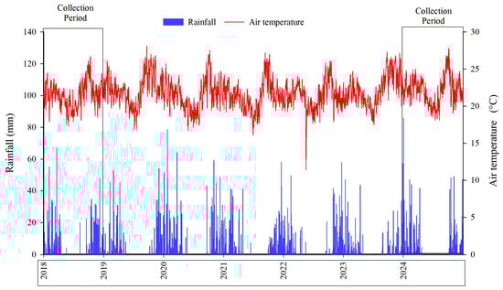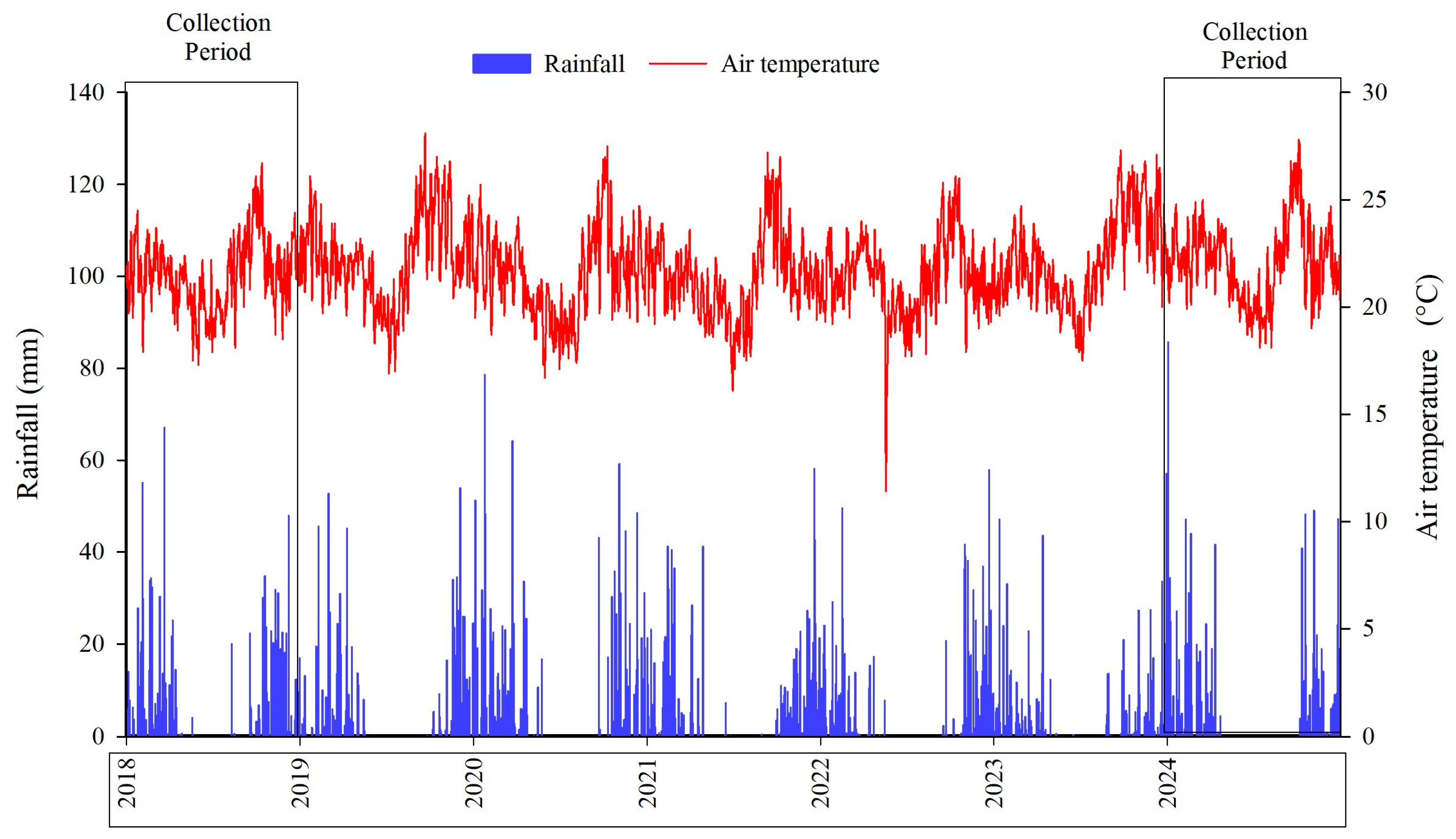 According to the Köppen–Geiger classification, the regional climate is Aw (tropical savannah), characterized by a distinct dry season (winter) and rainy season (summer) [70,71]. During the study period, the average annual rainfall was 1.187 mm and the mean air temperature was 21.73 °C. In 2018, the mean maximum and minimum temperatures were 28.63 and 15.89 °C, respectively, with total annual precipitation of 1349.40 mm. In 2024, the mean maximum temperature reached 29.46 °C and the mean minimum 16.37 °C, while total annual precipitation was 1278.20 mm (Figure 4).