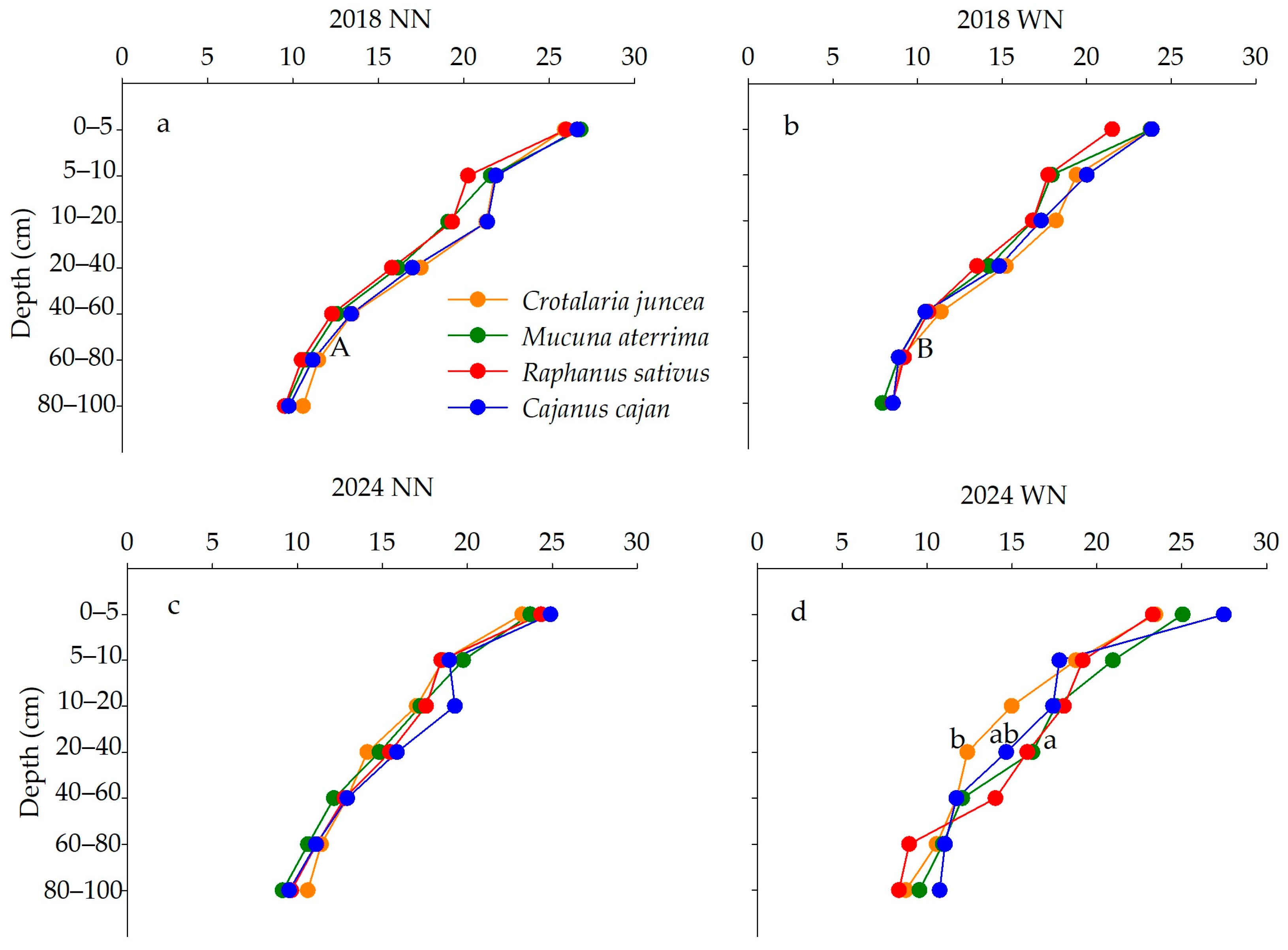 Residue inputs during the 2018 maize phase, characterized by a high C:N ratio, enhanced soil C stocks, compared to those recorded in 2024. In soybean–CC systems, introducing a CC with a high C:N ratio is essential to prevent C stock depletion [25]. Conversely, CCs with low biomass yield and low C:N ratio accelerate residue decomposition, resulting in lower soil C levels [25]. Following maize, legume cover crops are more effective in increasing soil carbon stocks, highlighting the role of N inputs in balancing the C:N ratio and fostering microbial mineralization [39,40].