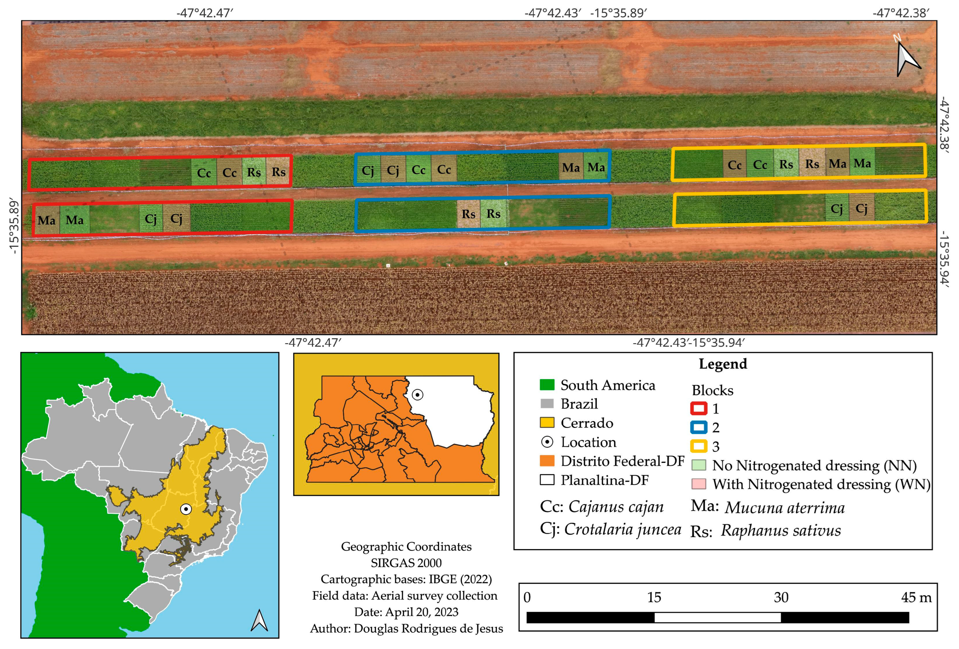 The experiment was conducted at Embrapa Cerrados, in Planaltina, Federal District, Brazil (15°35′50.12″ S, 47°42′26.97″ W; altitude 973 m). It was arranged in a randomized complete block design with split plots and three replications, with 12 × 8 m main plots and 6 × 8 m subplots (Figure 3). The main plots represented the CCs Cajanus cajan (L.) Millsp. (Fabaceae), Crotalaria juncea L. (Fabaceae), Raphanus sativus L. (Brassicaceae), and Mucuna aterrima L. (Fabaceae), while the subplots corresponded to the application or absence of N topdressing of maize (WN and NN, respectively).