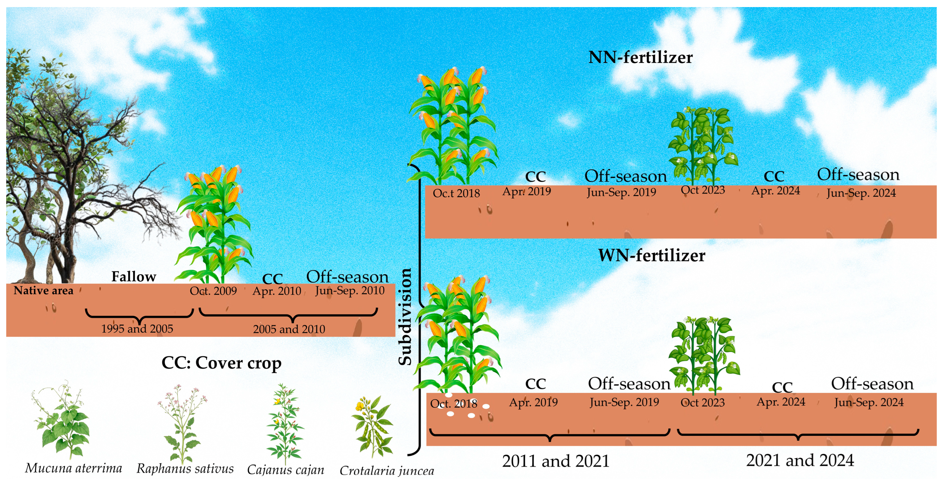 One widely adopted strategy to increase soil nitrogen (N) is the use of cover crops (CCs), a practice that has expanded rapidly in Brazilian agriculture, especially across the Cerrado biome. Cover crops can also contribute to building soil organic carbon (C) stocks [9,10]. When combined with N fertilization of the cash crop, CCs deliver multiple benefits: enhanced functional properties of the cover crop itself, higher yields of the commercial crop, and increased C sequestration in the soil. However, the magnitude of these benefits strongly depends on cover-crop species traits, particularly the plant chemical composition and the resulting effects on soil N cycling and availability [11].