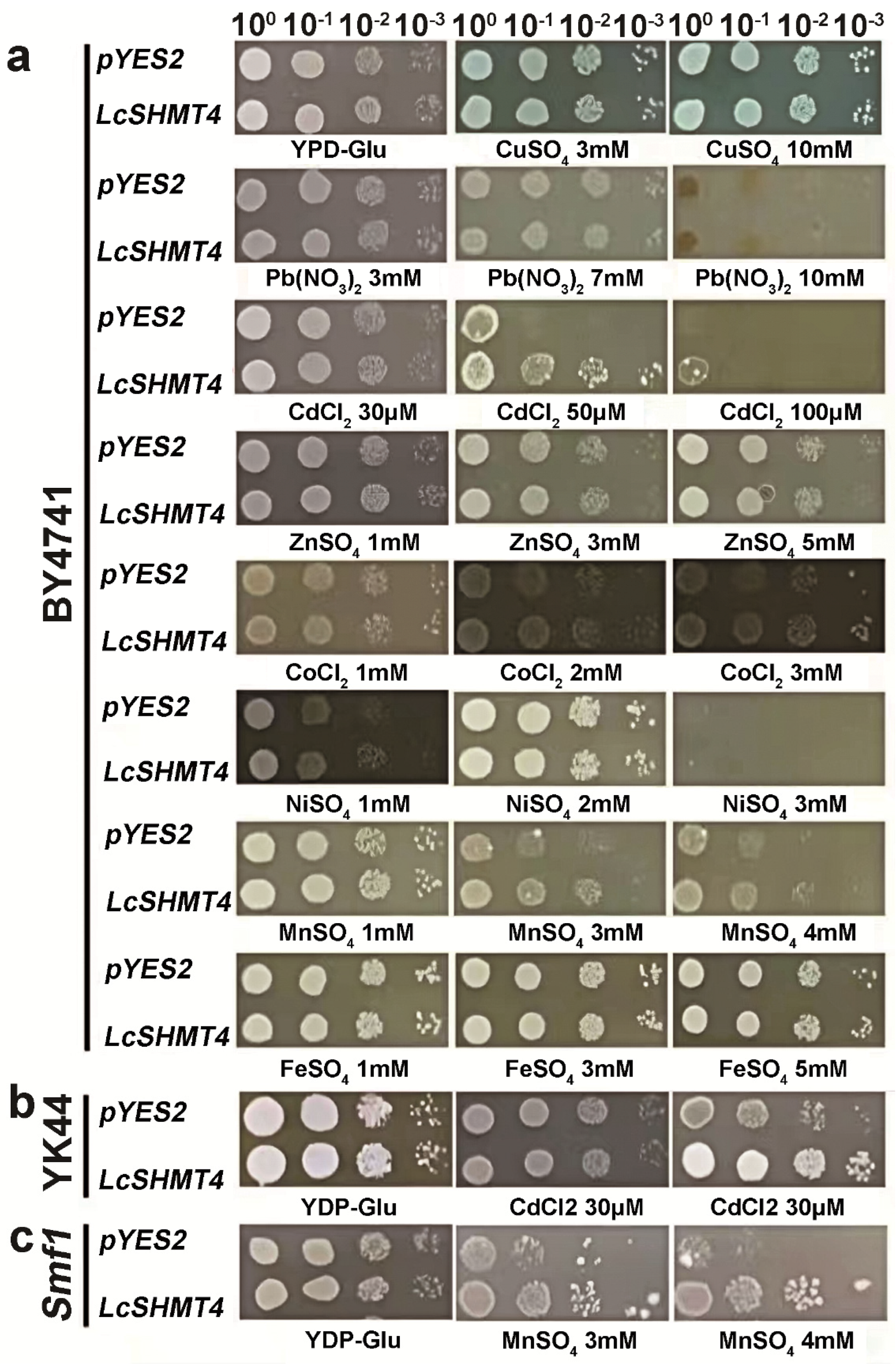 2.2. Cd and Mn Tolerance of Yeast Strains Expressing LcSHMT4